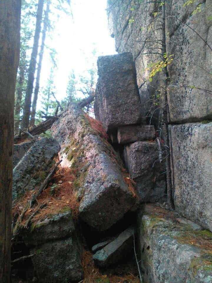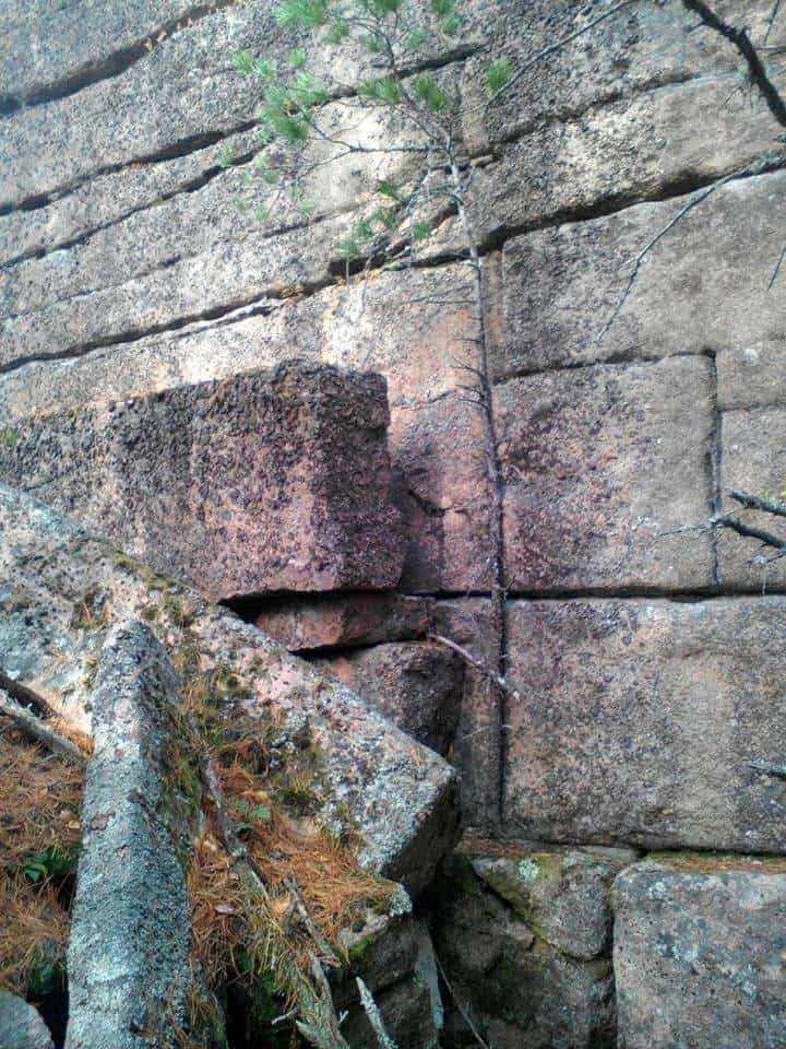 Неужели можете? А вот здесь тоже само положилось или растрескалось, а потом упало? Только не нужно говорить про особые свойства именно этого минерала, который трескается только под прямым углом. Там внизу уголок откололся у одного блока. А это значит, что материал этот вполне может трескаться всяко разно: