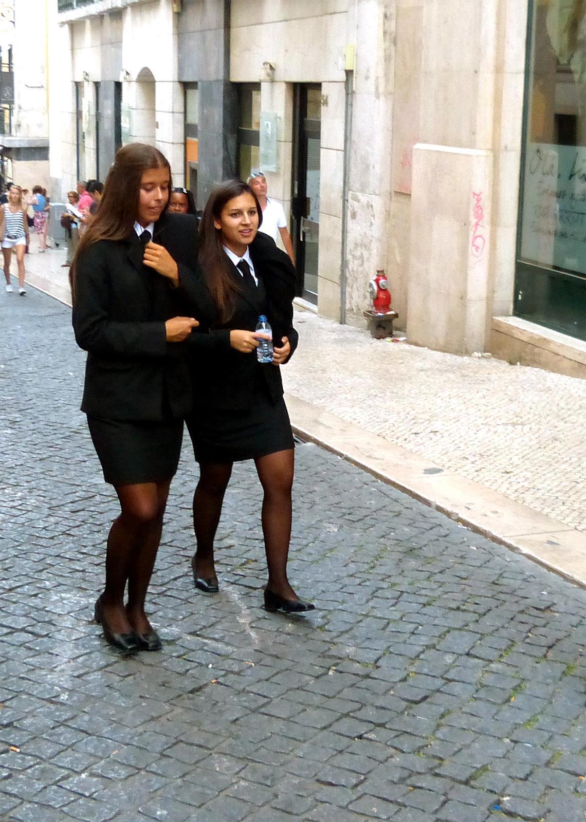 Автор: Д. В. АмурскийУ португальских студенток — очень строгая парадная форма одежды. К чёрному юбочному костюму, чёрным чулкам и чёрным туфлям-лодочкам с каблуками не выше пяти см полагается носить ещё и чёрный плащ на левом плече.