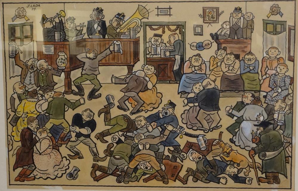 Самое начало заварухи. И оркестр радостно подыгрывает и бабенки с девками спокойны и трактирщик еще не понял, что пошла жара и только полицейский уже включился в работу. И маленькая заварушка посреди танцпола не шибко мешает пляшущим. Кому дамы не хватило - сам с собой пляшет. Да и детишки смирно стоят на печке. Хотя чуткий будочник забежал уже глянуть - что тут затеваетеся. Опыт - не пропьешь!