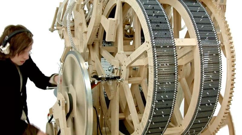 Принцип действия все тот же: разогнанные мраморные шарики, а их 2000, движутся по направляющим и попадают на разные модули, чтобы издавать звуки пианино, барабана, струнных музыкальных инструментов и т.д. Однако теперь все работает не от ручного привода, а от небольшого двигателя. Количество источников звука значительно увеличилось.