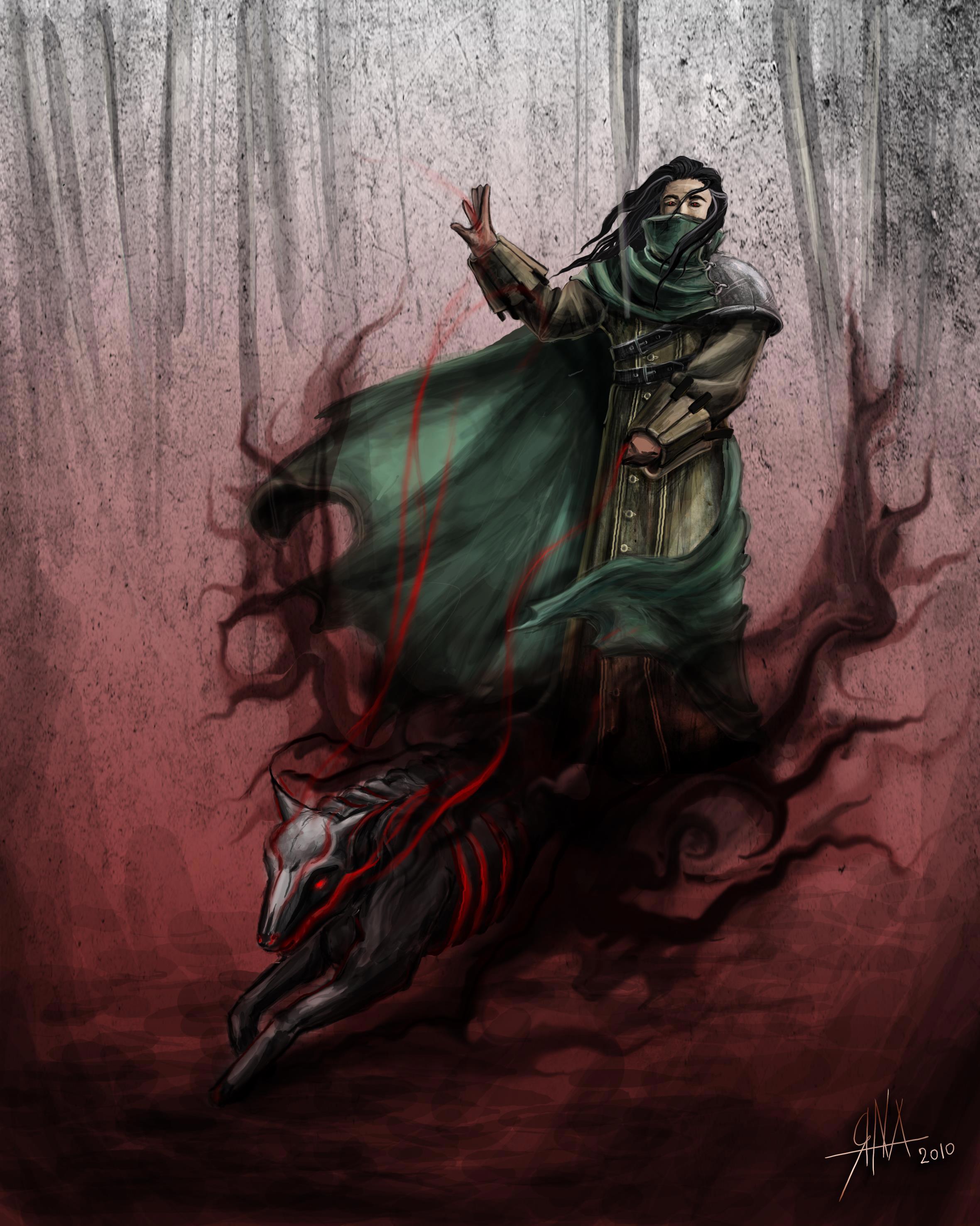 Губы Греллара зашевелились. Отзываясь на беззвучно проговариваемые формулы, угольный рисунок на камнях ожил. В стороны от основы расползлись тонкие змейки, свиваясь в знаки стихий. Наполняемые отпущенной по каналу энергией, символы слабо заискрились, почти исчезли в солнечном свете. Тогда Нод сделал плавный пасс рукой — и из чаши вверх поплыла нить. Она струилась красной жилкой над „колесом“, повторяя форму его лучей, пока не улеглась, соединив все четыре статуэтки. В это самое мгновение из комочков чёрной глины плеснули ленты тьмы и крови, что, смешиваясь, начали приобретать форму и плотность. Минуту спустя четыре остромордых длинноногих тени прыгнули с порога, вытягиваясь в полёте, и за ними сорвались с места егеря.»