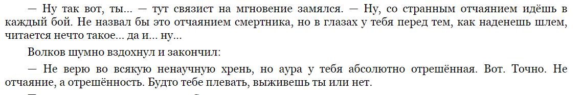 Можно даже совместить обе интерпретации, тогда становится ещё смешнее. Получится что-то вроде бессмертных кунуроев Бэккера, которые прожили так долго, что исчерпали лимиты памяти и вынуждены использовать дополнительные носители информации в виде памяти других существ. Или с особым цинизмом убивать тех, кого хотят запомнить — слабые стимулы на них уже не действуют. Так и наш герой слегка поехал, получив доступ к своим скрытым воспоминаниям и осознав, что прожил уже не одну жизнь и всё это время где-то воевал.