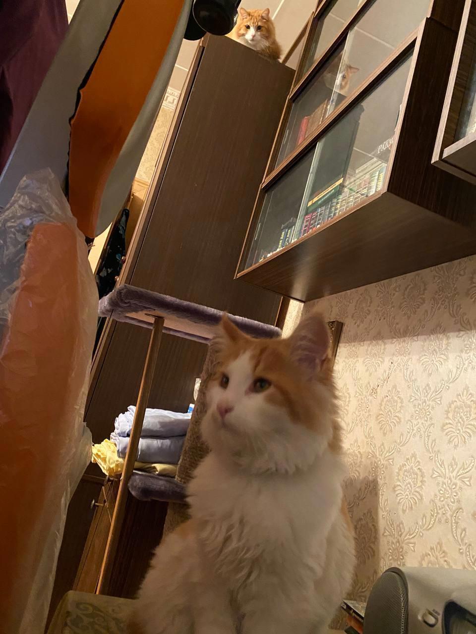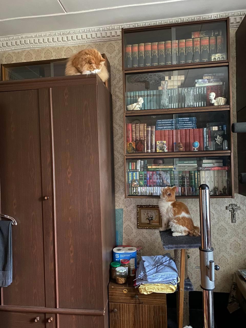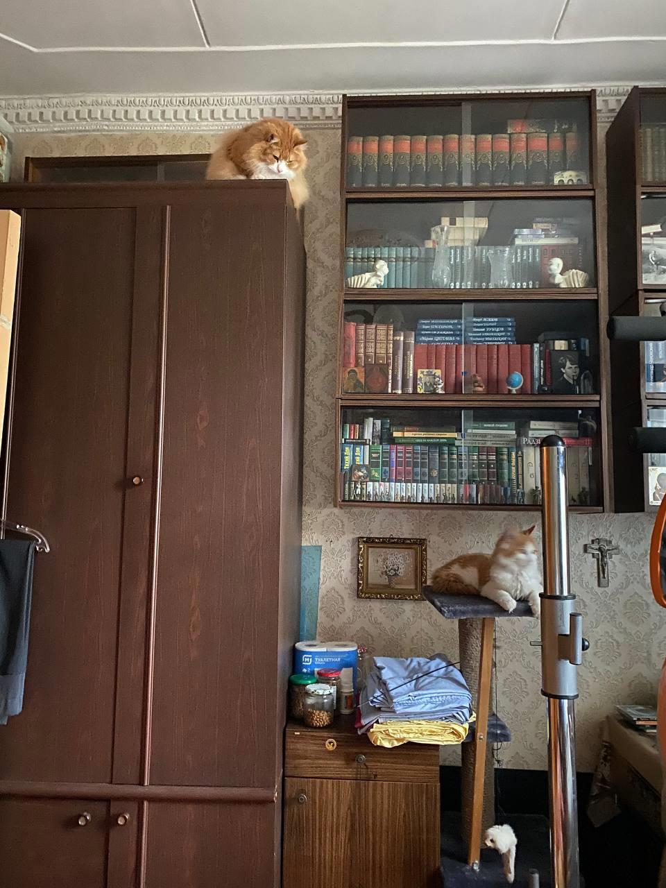 А Филимон так и продолжал сидеть на шкафу. В течение дня Кнопу запирали в Сашиной комнате на 15-20 минут, чтобы Филя мог сходить в туалет и покушать. Но дольше держать её там не получалось, потому что она начинала истерить: жалобно мяукать, прыгать на дверь и расцарапывать её. А когда Кнопку выпускали, она бежала искать Филю, чтобы снова загнать его на шкаф.