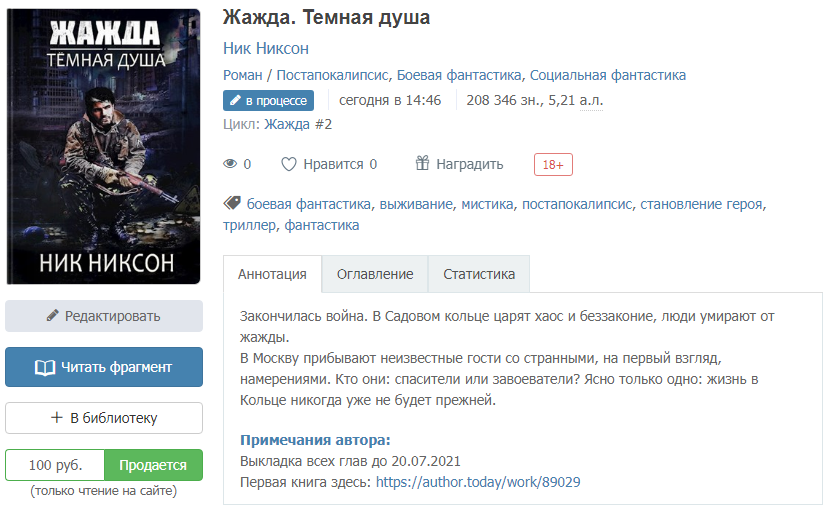 Автор: Ник НиксонДрузья, рад сообщить, что вторая часть Жажды выложена на сайт. Пока доступно 8 глав, остальные на стадии редактирования и будут выложены до 20.07.2021. На этот раз книга платная, надеюсь на ваше понимание.