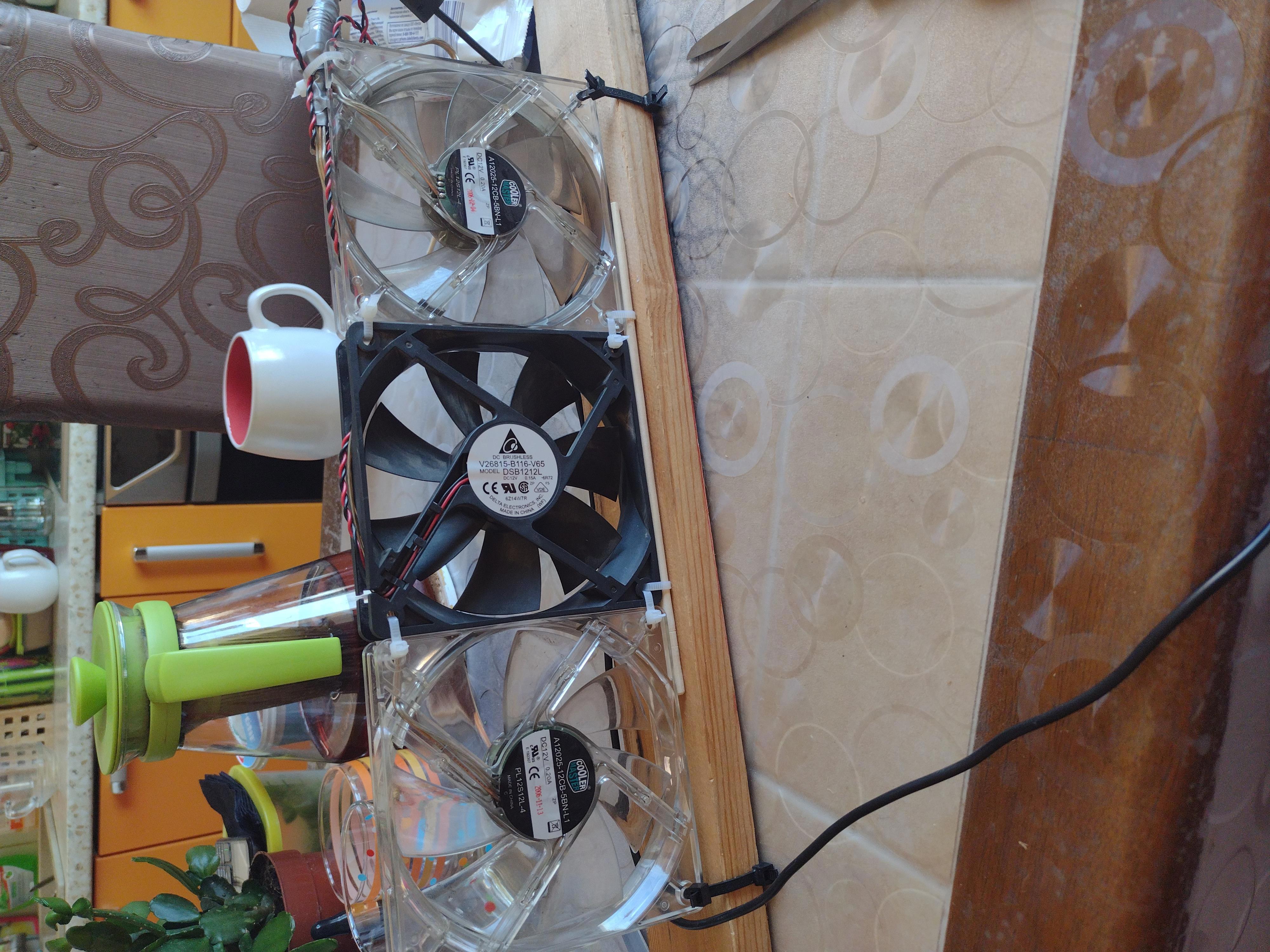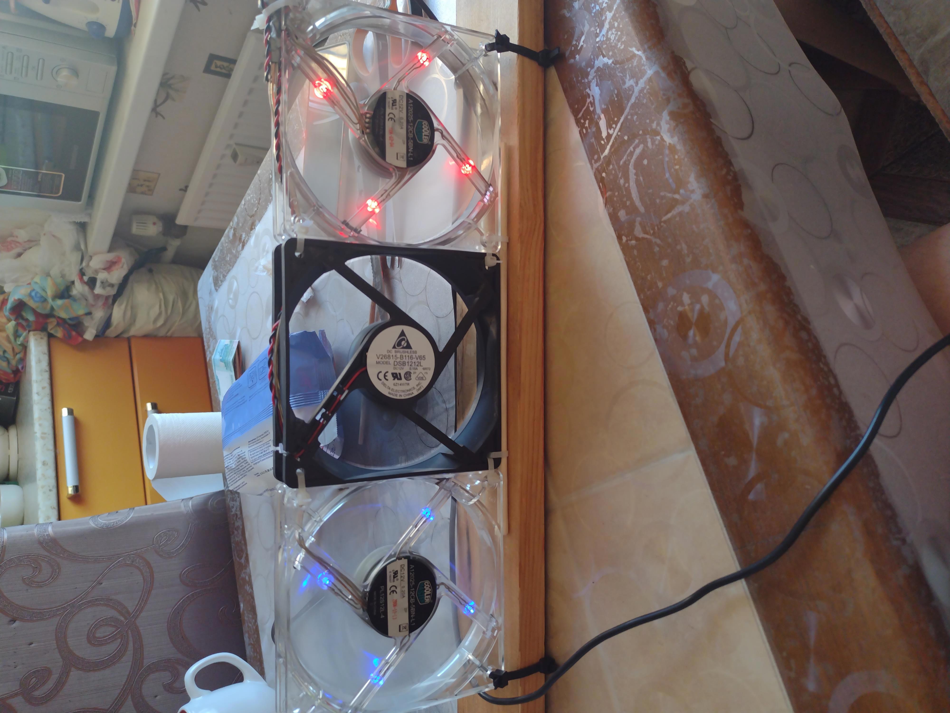 Санкт-Петербург, жара стоит ужасть! Настолько, что вентилятор любой модификации в магазине найти не реально... Собрал вот такое "чудо" из старых кулеров и блока питания от ноутбука. Хорошо