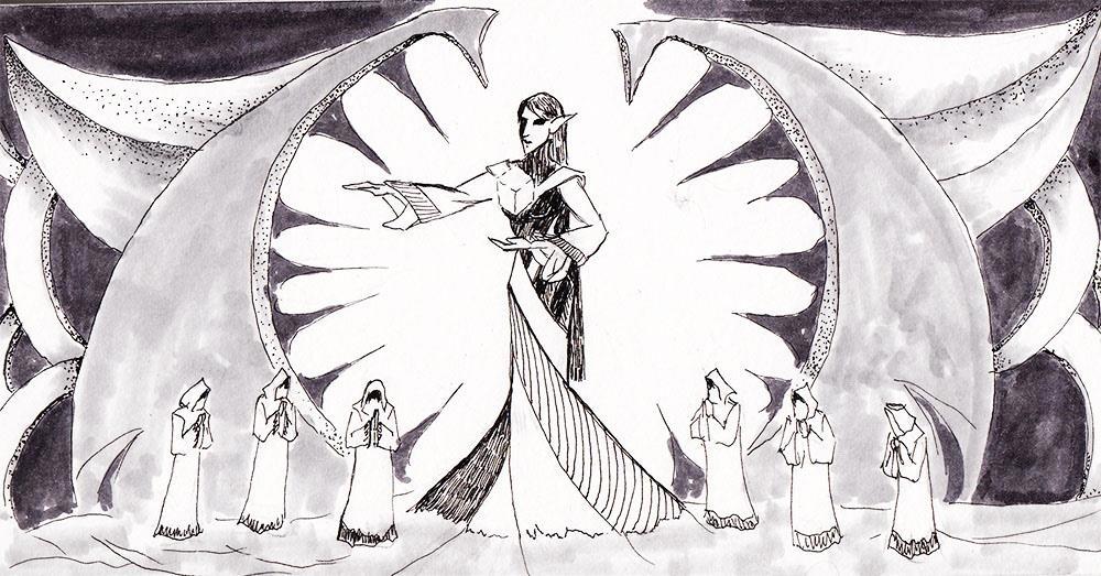 И она слепила из крови и пепла себе помощников — прекрасных бессмертных эльфов. Она учила их магии и они были ее секретарями, библиотекарями, лаборантами и любовниками.