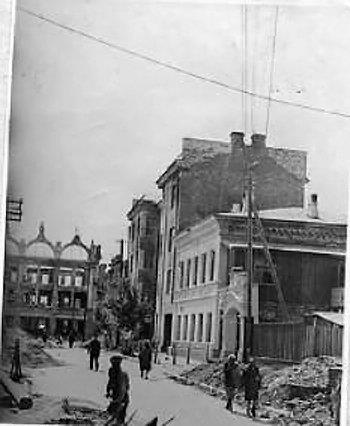 Следующее фото сделано несколькими годами позже - дома на Пролеткультской уже восстановлены на фоне окружающих их руин - особенно впечатляет всё ещё не снесённый фрагмент стены бывшего Дома Клёнова (того самого, что был вороватым градоначальником Царицына - https://author.today/post/137604 ) с очень характерными башенками на противоположной стороне улицы Гоголя: