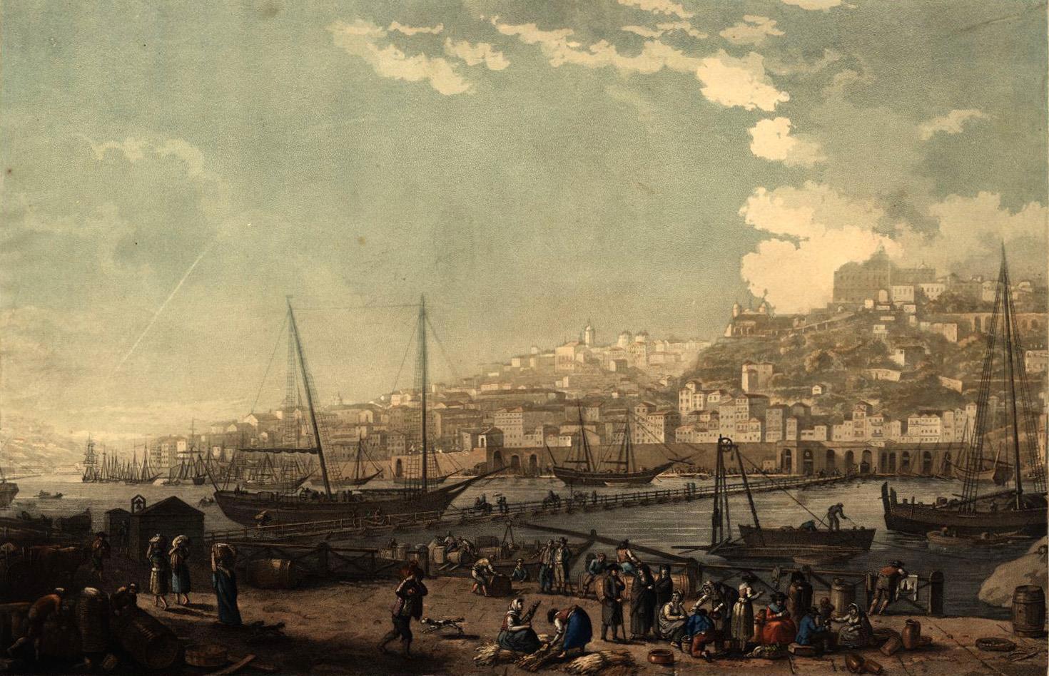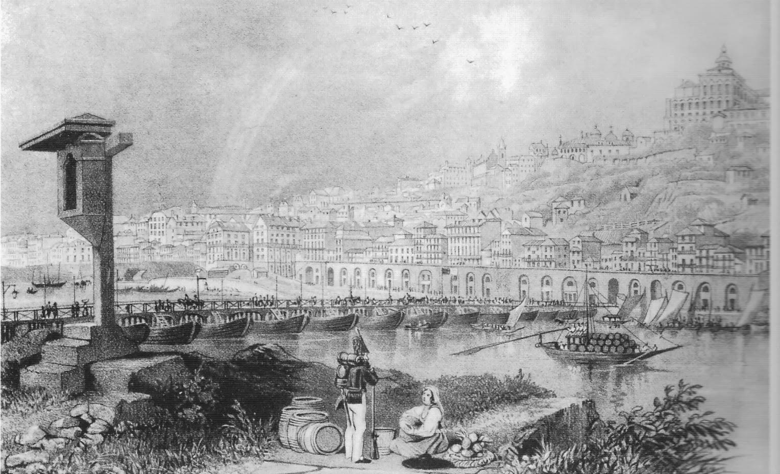 Понтонный мост через реку Дору в Порту. 1819 год. Ponte das Barcas, построенный в 1806 году выглядел примерно так же.