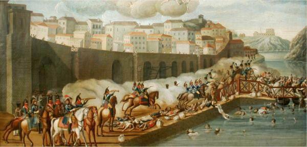 При известии о том, что в город входят французские солдаты, на Ponte das Barcas хлынул людской поток. Бежали жители Порту, опасающиеся грабежей и насилия, бежали отступающие португальские солдаты — давка была жуткая. Французская кавалерия, прорвавшаяся к набережной Рибейры, в добавок ко всему открыла огонь по плотным людским массам. В это же время португальская артиллерия на другом берегу реки начала стрелять по французским кавалеристам на мосту, чтобы замедлить их продвижение. В итоге мост не выдержал нагрузки и развалился. Более четырёх тысяч человек погибло при коллапсе Ponte das Barcas. Если учесть, что всё население Португалии тогда составляло примерно три миллиона человек, а в Порту насчитывалось около пятидесяти тысяч жителей, то можно себе представить масштаб бедствия! В один момент исчезло 8% населения города!