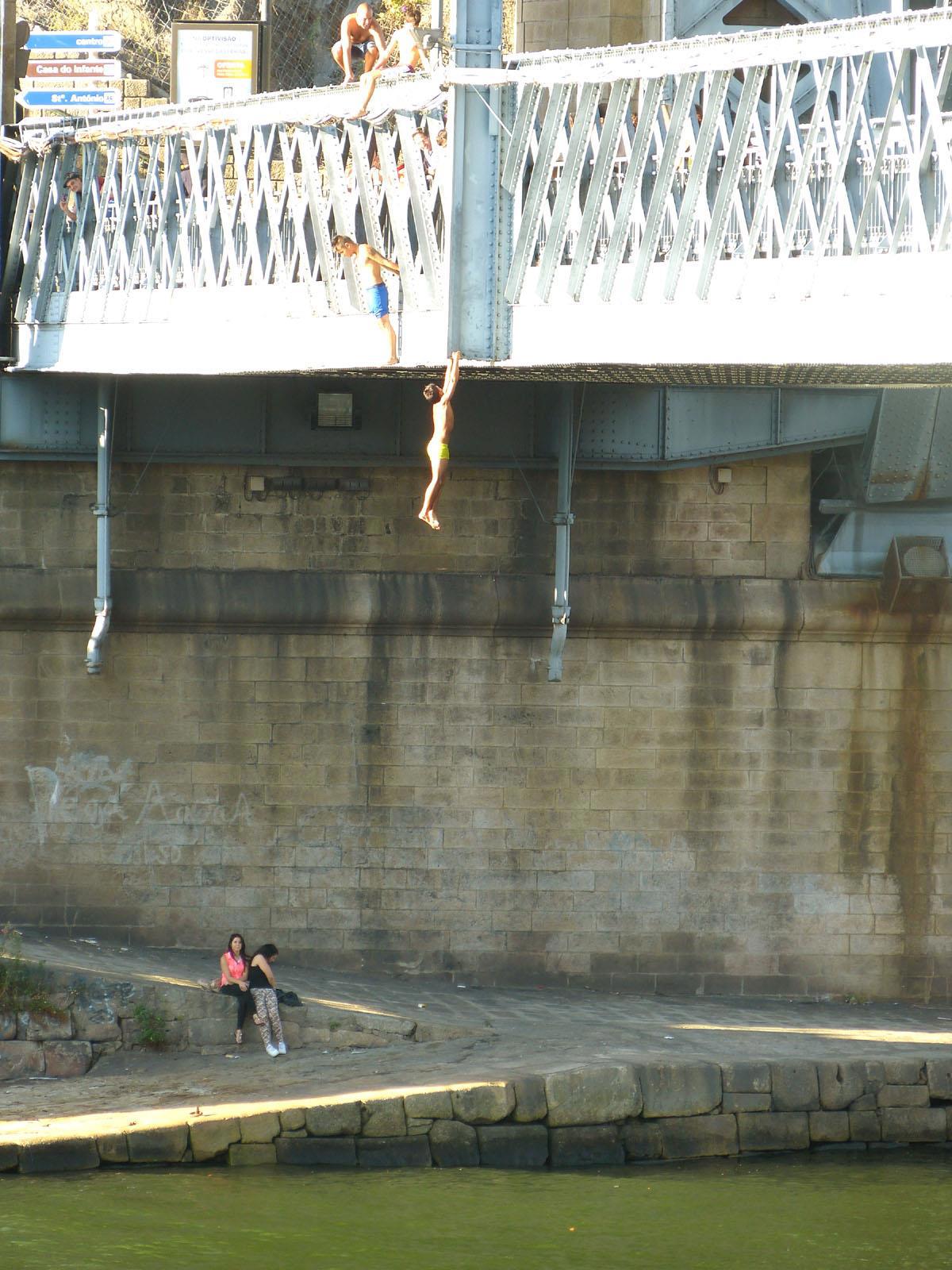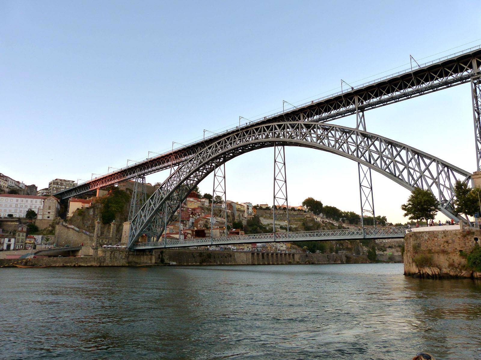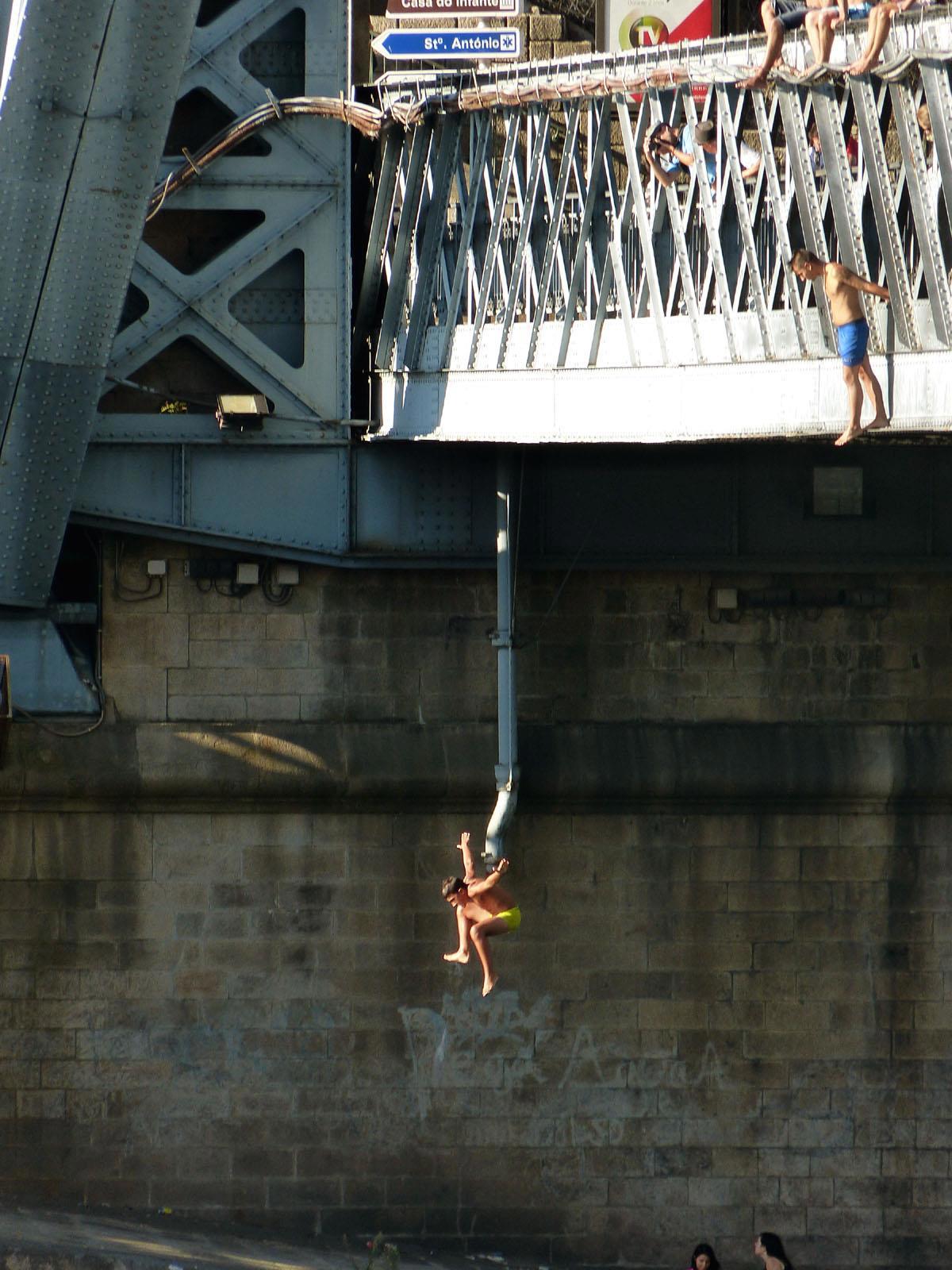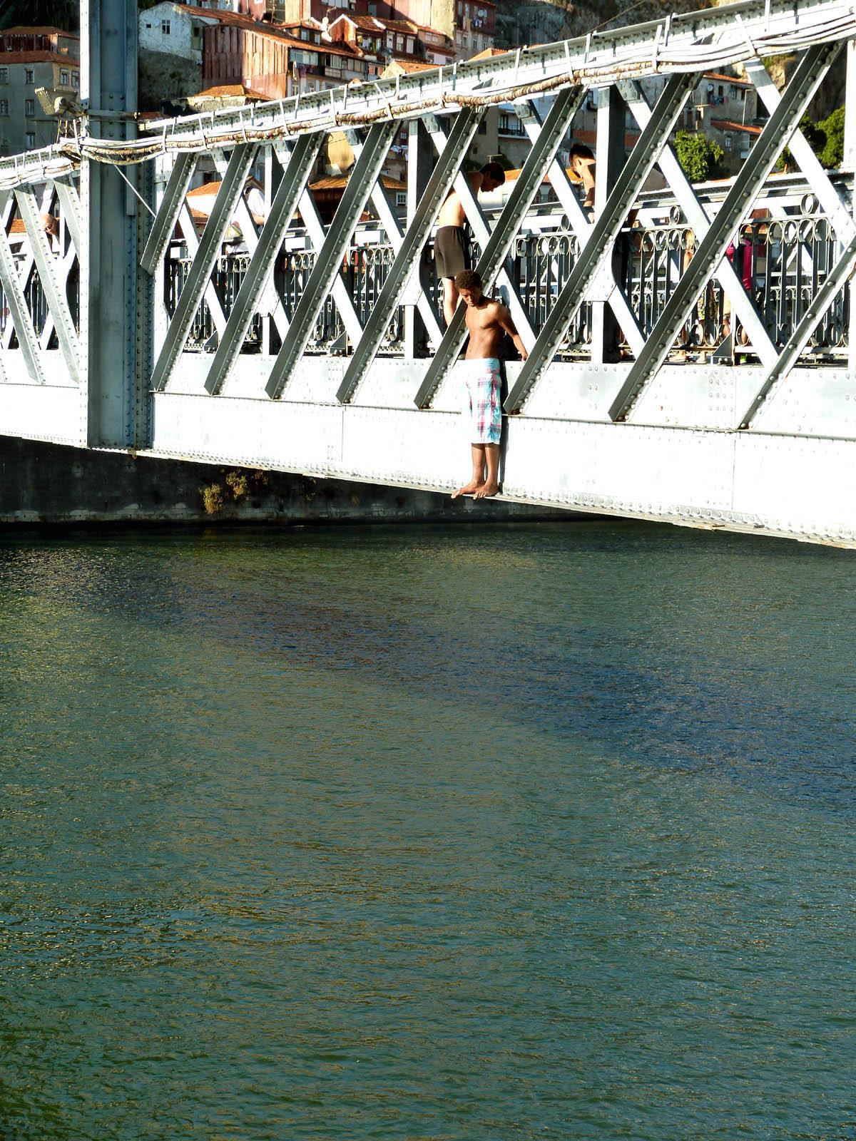 И вот как-то во второй половине дня мы гуляли возле Ponte Luís I. Этот мост построили в 1886 году по проекту ученика и компаньона Гюстава Эйфеля Теофила Сейрига. Сооружение, что и говорить, впечатляющее. Длина арочного пролёта — 172 метра, высота верхнего уровня, по которому движутся трамваи и пешеходы, — 44,6 метров. Даже с нижней палубы моста до реки — метров 8-10. Приличная высота.