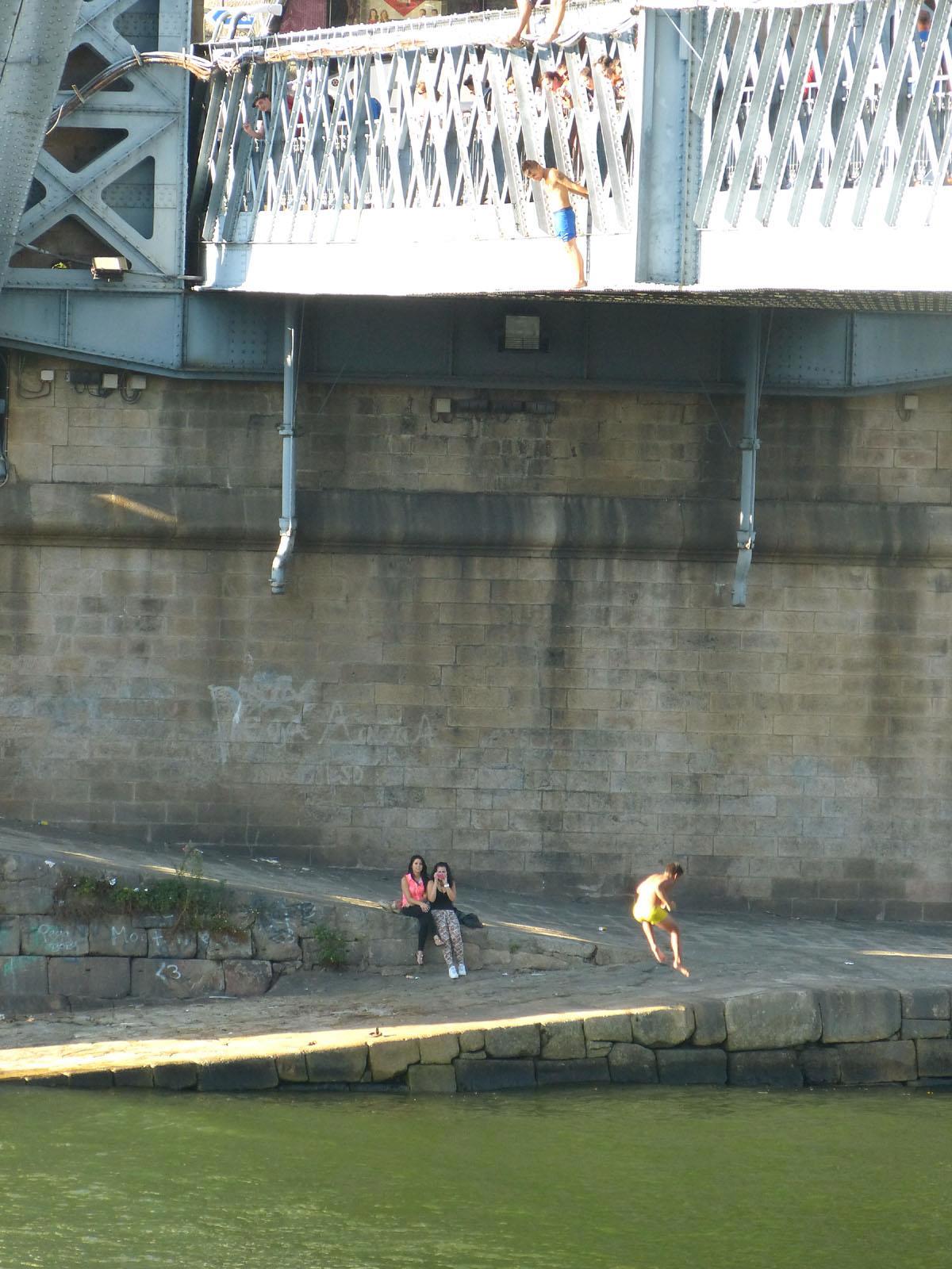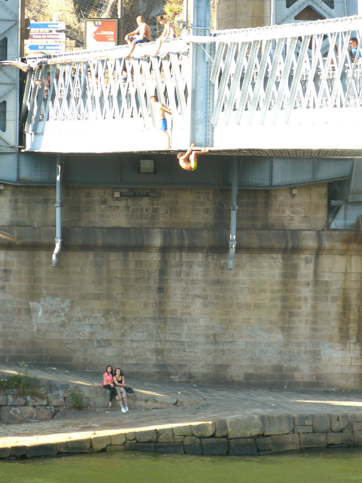 И что же мы видим? На мосту собрались подростки. Один из них, парнишка лет 13-15 в жёлтых плавках, смело пролазит через ограждения, проходит по выступающей наружу части конструкций и крепко хватается обеими руками за головки заклёпок.