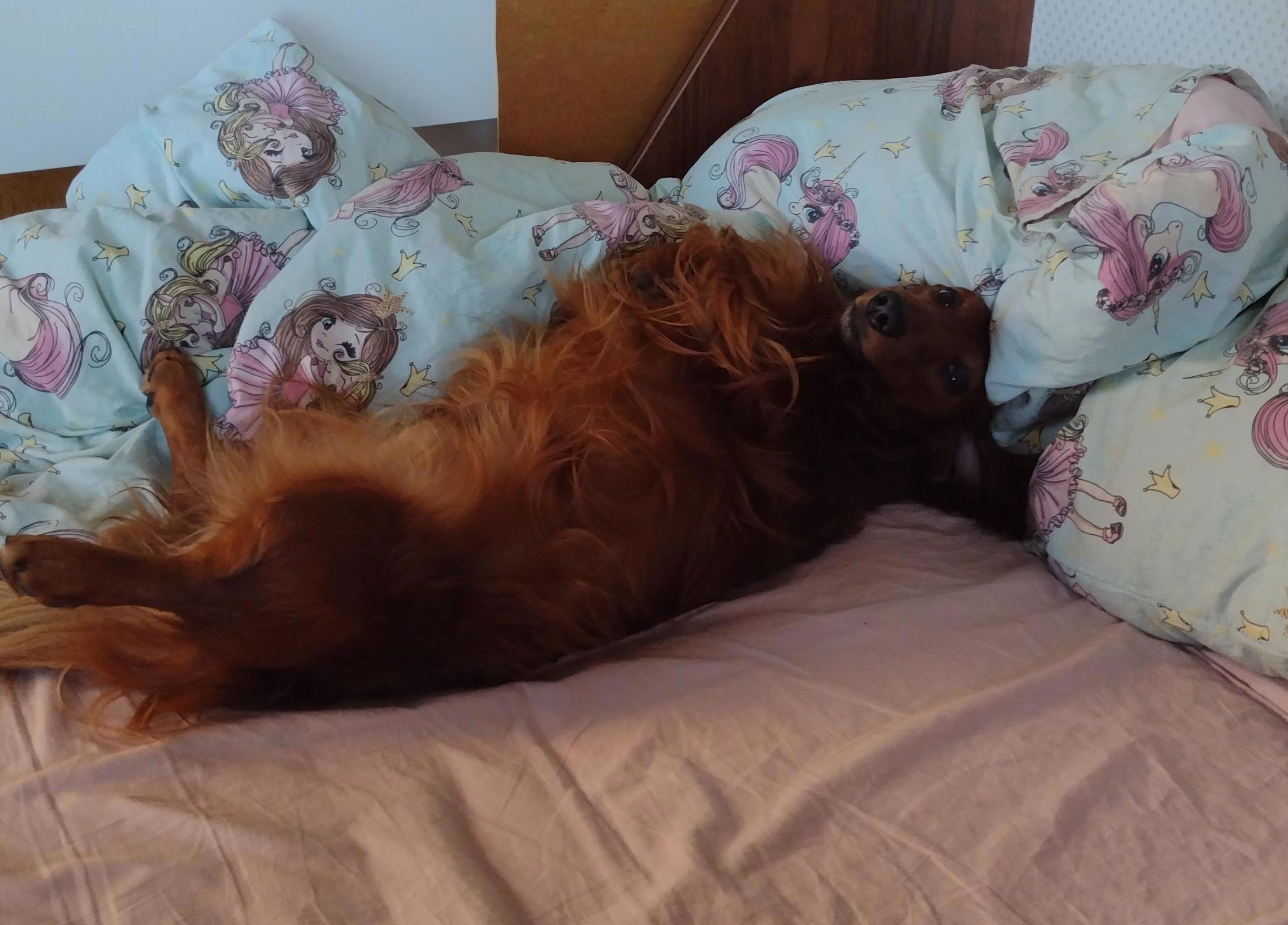 Это моя такса. На диване может лежать сколько угодно. И, даже, начать "охранять" место от людей. Беззлобно, но очень недовольно:) . Гавкает эта собака на всех кто не нравится - знает при этом, что так делать низзя. Есть у собаки друзья, есть недруги. Один из таких недругов - крупная булька. Знает, что перегавкиваться нельзя... и вот в один из дней встретились две собаки, друг на друга не смотрят. Нет врага. Моя псина, вдруг решила поласкаться - балую иногда, а тут залезает на ручки, и давай лизаться. Подлизывался он так пару минут, слез, показал врагу
