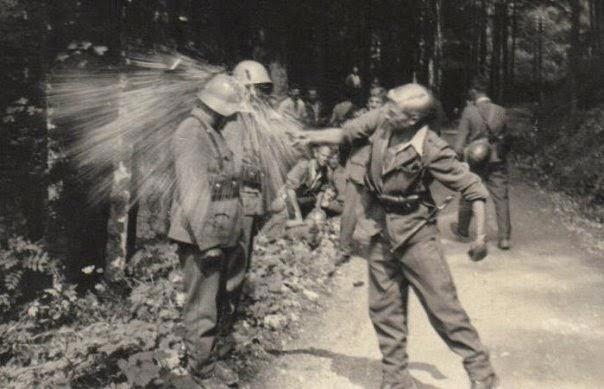Непонятное фото. Вроде как рядовой немец лупит по башке бутылкой своего сослуживца. Причем лупит старательно. От души. Но форма у обоих странновата и гарантировать, что это точно немцы я бы не стал. У соседа к слову, огребшего по каске - своя каска странновата. ТОчно не немецкая. На финнов тоже не похожи - ткань у финнов потоньше на форму шла.