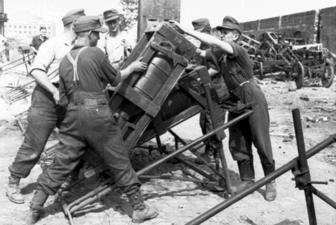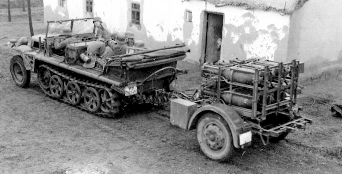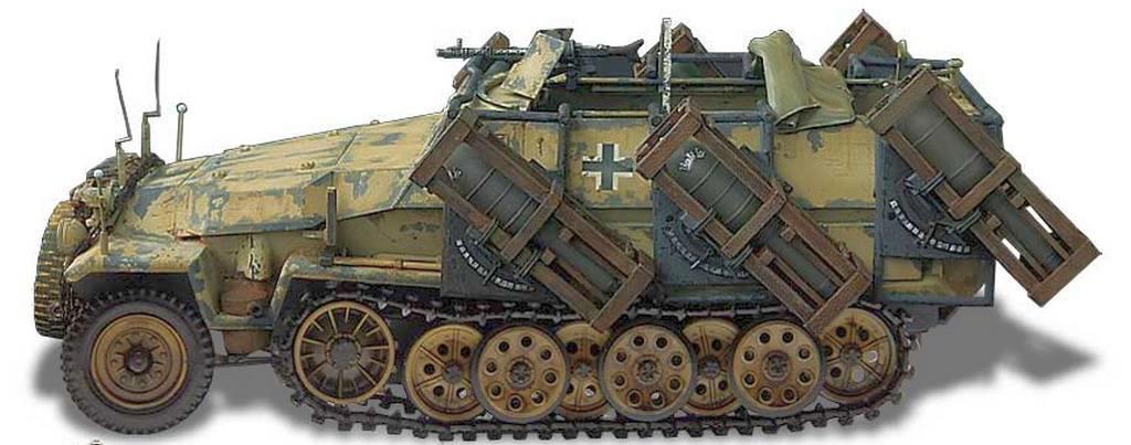Чем дольше длились боевые действия, тем увлекательнее немцы на них реагировали. Крупнокалиберные реактивные мины додумались запускать прямо с транспортировочных контейнеров, для чего их снабдили ножками. Понятное дело, что ни о какой точности здесь речи быть не может совсем. Ещё любопытнее в плане точности вот такое «вьючное» крепление пусковых ящиков к бронетранспортёрам: