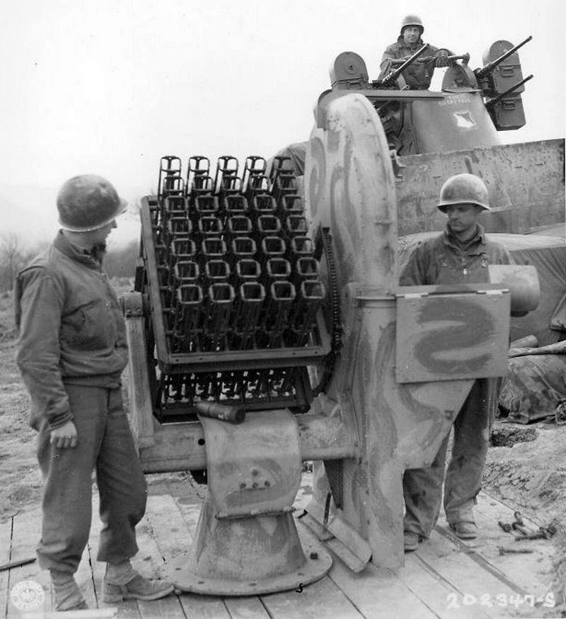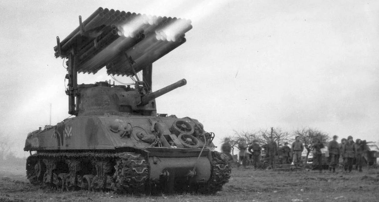 США не сильно отличались от Англии в части развития сухопутных войск перед Второй Мировой (вся армия 200 тыс. чел.), но спохватились вовремя и начали что-то быстро проектировать, строить и насыщать. Не забыли и про ракетные установки залпового огня. Может опыт СССР запал в душу, а может и сами смикитили – бог весть. Первую ракету сделали только в 1942 году ожидаемо для авиации. Назвали скучно – М8 (не путать с нашей). Калибр – 114 мм, БЧ – 1,9 кг взрывчатки. Применять эти снаряды начали только после года тренировок – в 1943 году. Рассеивание было очень большое, поэтому стреляли по площадям.