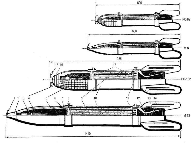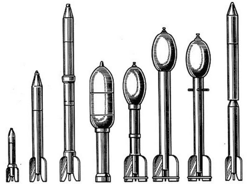 Вот здесь далеко не полный ряд реактивных снарядов, которые выпускала наша промышленность во время войны. Это только самые основные варианты ракетных боеприпасов: