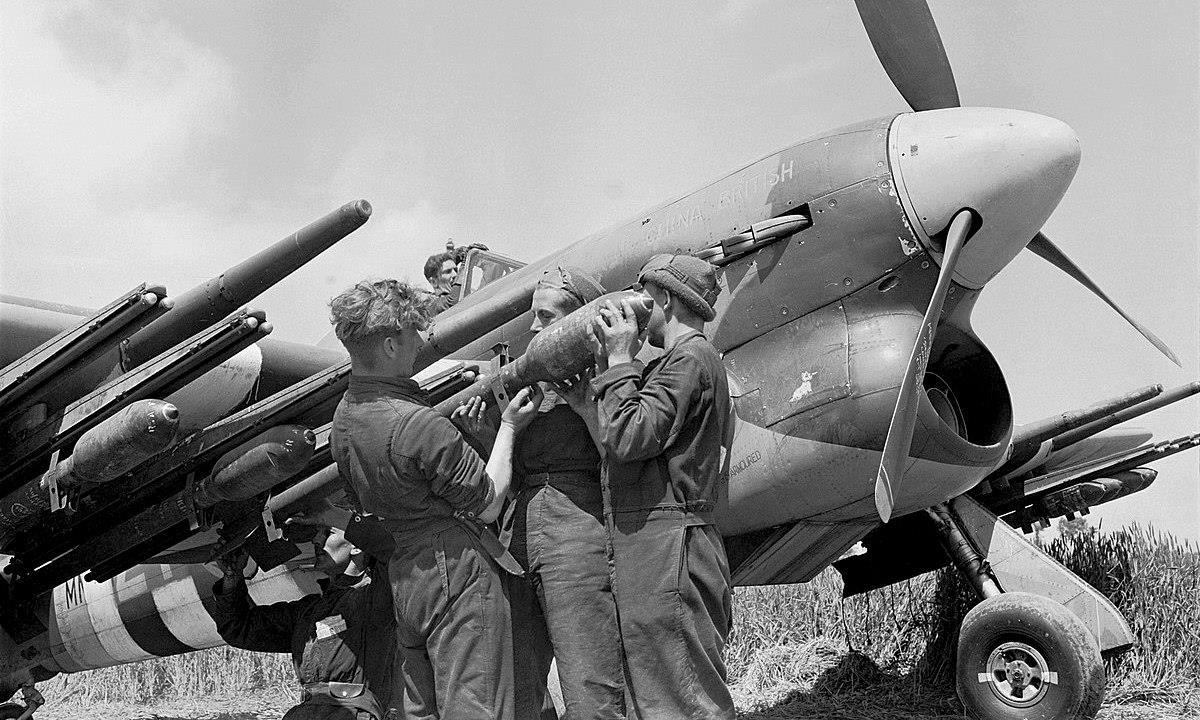 Правда появились они только в 1944 году. А вообще «двухдюймовые ракеты» быстро проникли и на королевский флот, поэтому их можно считать универсальными. Они были просты в производстве. Пусковые установки тоже были рельсовыми. Всё просто и достаточно надёжно. В 1937 году англичане сделали более мощную «трехдюймовую ракету» (76,2 мм). Прошло совсем немного времени и её заметили лётчики. Рельсовые направляющие для запуска появились и на английских самолётах. Это «Тайфун»: