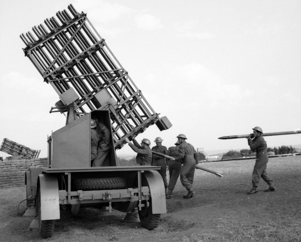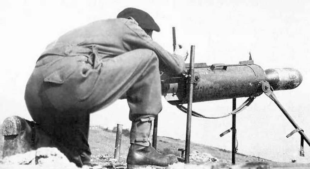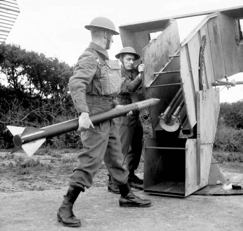 Англичане. Сидя на своём островке, они осознавали, что главная их головная боль – это вражеская авиация и флот. Что касается сухопутных сил, то силами их назвать можно было достаточно условно. Ведь их армия годами была приучена воевать против практически безоружных аборигенов в колониях и всё. Серьёзный противник их пугал, что они отлично продемонстрировали с началом боевых действий, геройски сбежав из Дюнкерка и некоторых островов, побросав матчасть и снабжение, и даже не попытавшись обозначить сопротивление. Совсем другое дело – авиация. В 1934 году они поставили на вооружение зенитную «двухдюймовую ракету». Вот эта ракета и пусковая установка: