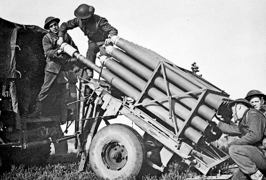 В том же 1944 году на вооружение англичан появилась ещё одна очень своеобразная пусковая установка. Назвалась она «LILO» и предназначалась для применения в гористой местности. На ракетах в этом случае применялись боеголовки массой 18 и 35 кг фугасного действия. Дальность очень небольшая, рассеивание просто запредельное, но в горной местности это было всё одно лучше, чем тащить по склонам тяжёлую пушку. Вот эта установка: