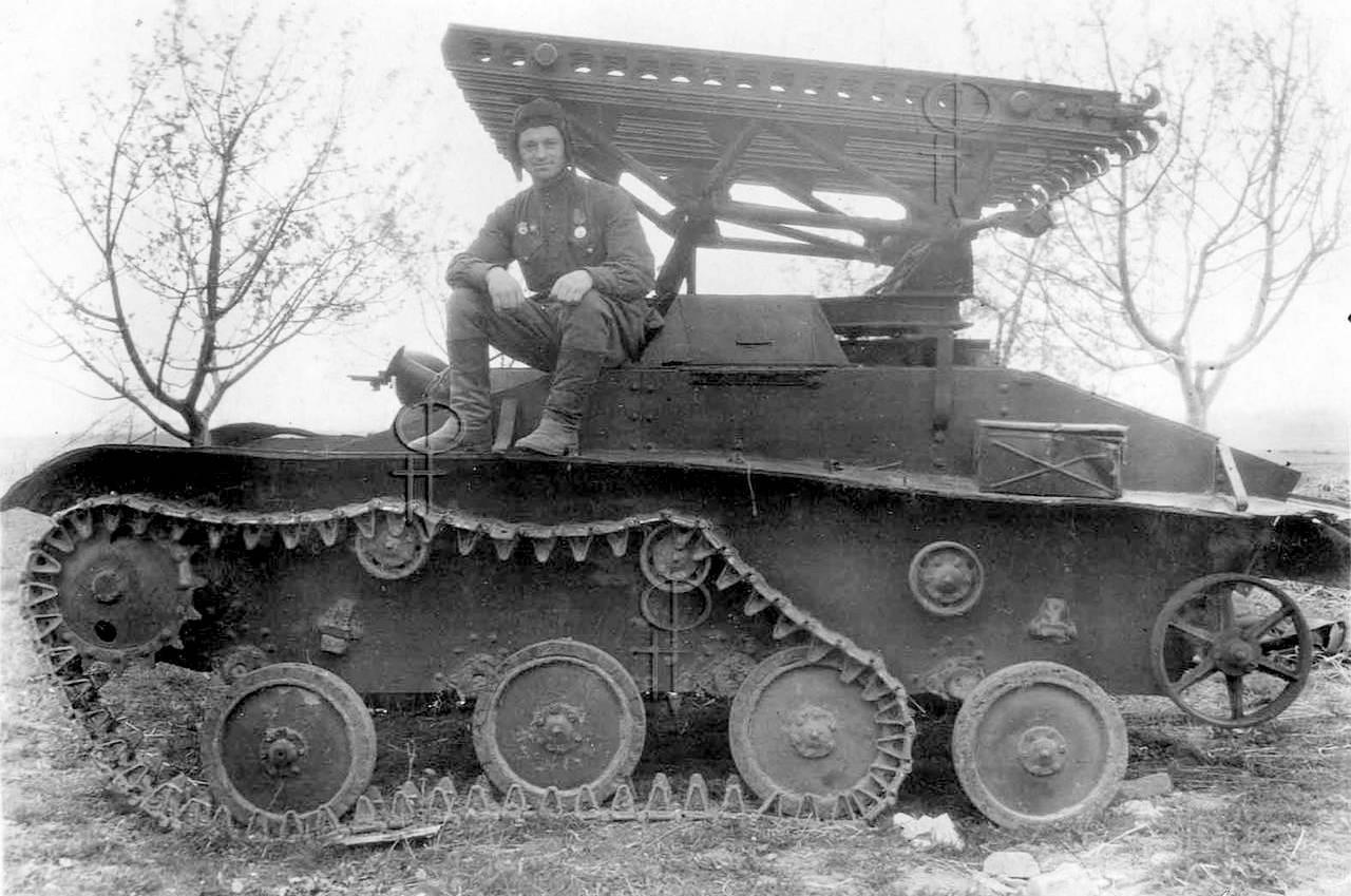 На этих установках минимальный угол возвышения был 15 градусов, что позволяло стрелять на дистанцию не менее 2-3 км. В 1943 году стали выпускать установки БМ-13Н с минимальным углом возвышения 4,5 градуса. В самом конце 1941 года пусковые установки ставили также на шасси различных иностранных машин. Чаще всего американских «Studebaker US6». Использовались также тягачи СТЗ-5 «Сталинец». Их использовали из-за высокой проходимости. Для использования в непосредственной близости от передовой в период с 41 по 43 год выпускались пусковые установки на базе лёгких танков Т-40 и Т-60. Обозначение БМ-8-24. Вот интересное фото такого варианта: