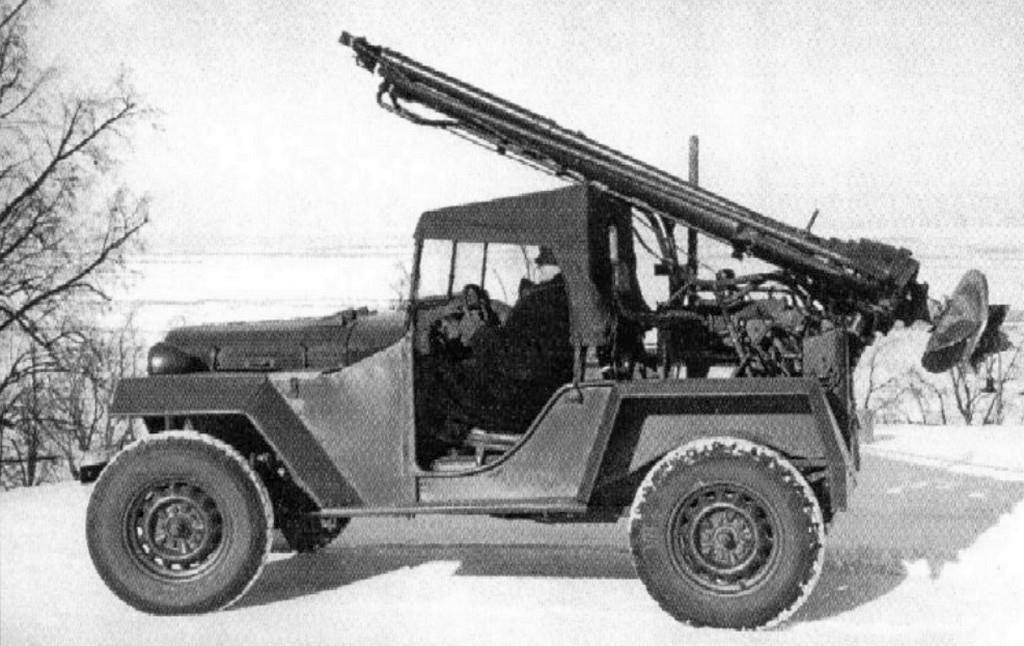 Она разбиралась на три части и могла транспортироваться на вьючных животных в том числе. Предусматривалось два типа запуска ракет: пиропистолетами и электрозапуском от аккумуляторов. Эти установки монтировали на автомобили ГАЗ-67 или «Виллис-МВ». Такая установка называлась БМ-8-8, но это был «редкий зверь». Восемь ракет М-8 с дальностью выстрела до 5,5 км. Вот фото: