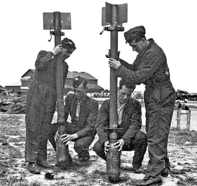 Продолжались эксперименты во время войны и с «трёхдюймовыми ракетами». Дело было в авиации, которая воевала с подразделением Роммеля в Северной Африке. К двигателям (труба с крылышками) привинчивали прямо на аэродроме бронебойные боеголовки калибра 87,3 мм или осколочные калибра 114,3 мм. Вот так просто это делалось: