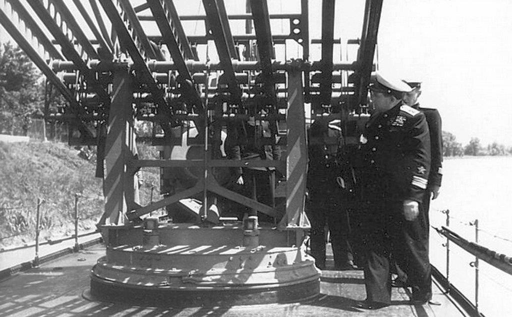 Устанавливались пусковые установки для ракет и на катерах и кораблях. Вот адмирал Холостяков осматривает установку для пуска М-132 на катере: