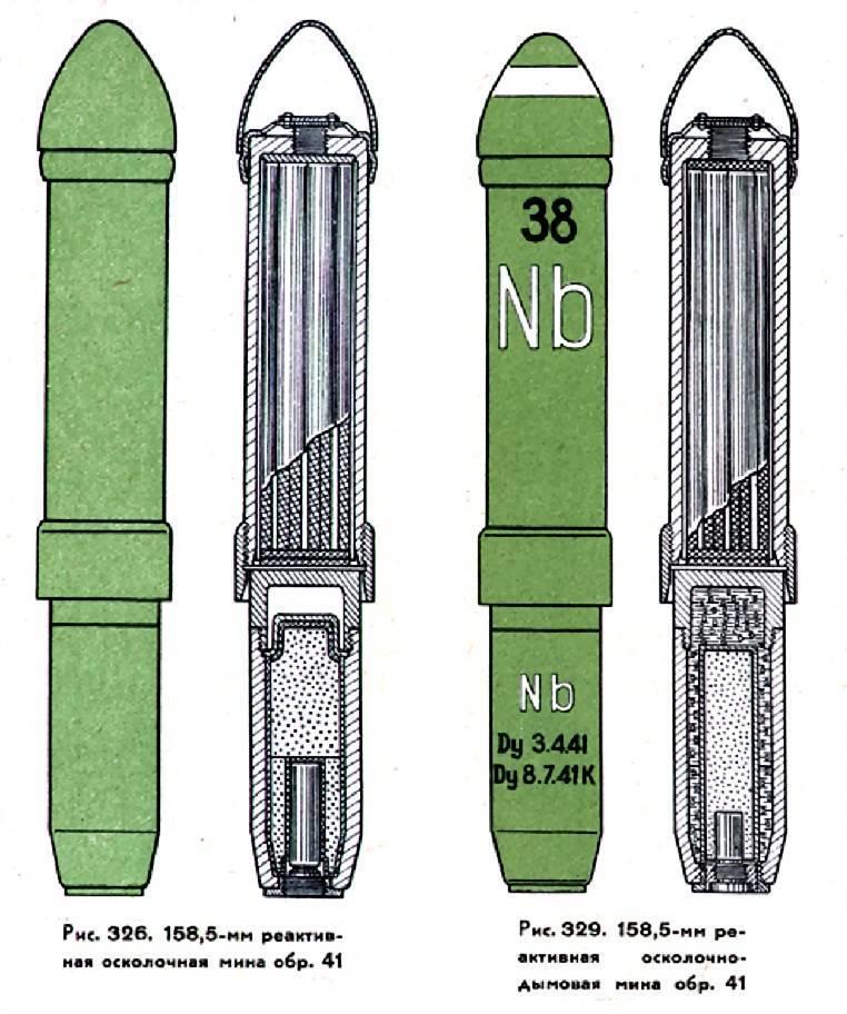 Начали они в 1941 году с шестиствольного реактивного миномёта калибра 158,2 мм, который довольно часто мелькает в кадрах кинохроники и сейчас наиболее известен широкой публике. У него сразу обращает на себя внимание его название – «Nebelwerfer» («Туманомёт»). Оно с головой выдаёт его первоначальное предназначение, которое обуславливает и особенности конструкции. Он был сделан для дистанционной постановки дымового заграждения и для удара отравляющими газами. Отсюда и относительно большой калибр. Отравляющие вещества применять не решились, а вместо них сделали фугасную боевую часть. Дальше немцы постарались его сделать как можно меньше по размерам, так как использовать собирались буквально на переднем крае. Двигатель слабенький – дальность выстрела небольшая (до 6,9 км). Сами ракеты для «Туманомёта» назывались «Wurfgranate 41» и были устроены вот так: