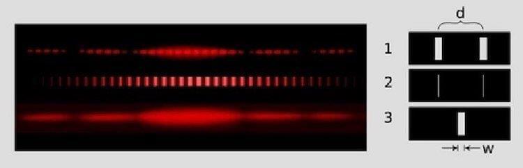 Свет, проходящий через две толстые щели (сверху), две тонкие щели (в центре) или одну толстую щель (снизу), демонстрирует интерференцию, указывающую на его волновую природу. Но в квантовой гравитации некоторые ожидаемые интерференционные свойства могут быть невозможны