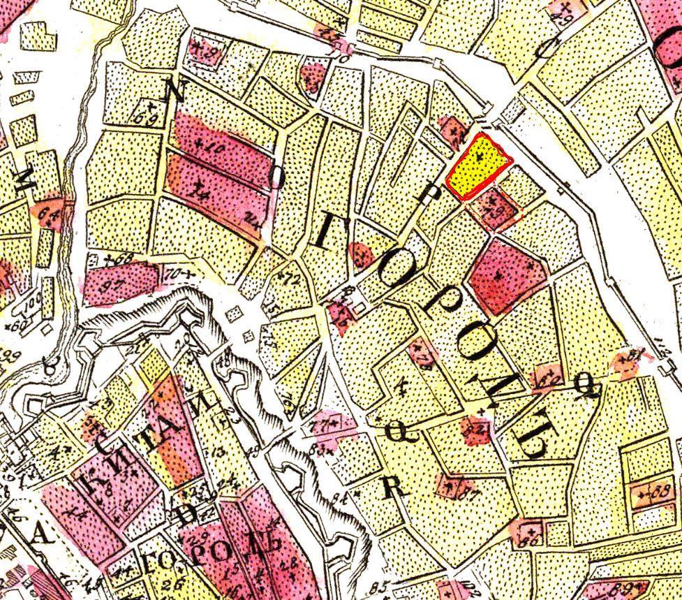 На карте Москвы, составленной в 1739 году архитектором Иваном Фёдоровичем Мичуриным, я пометил жёлтым двор Меншикова и обвёл его красным, а церковь указана на карте под номером 79. Мясницкая улица отмечена буквой P.