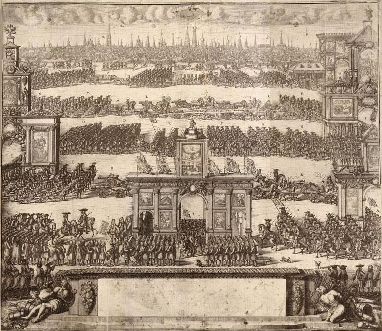 Зубов А.Ф. Торжественное вступление русских войск в Москву после Полтавской победы 21 декабря 1709 года. Первый вариант гравюры. Меншикова башня видна на заднем плане слева, между левым краем и колокольней Ивана Великого.