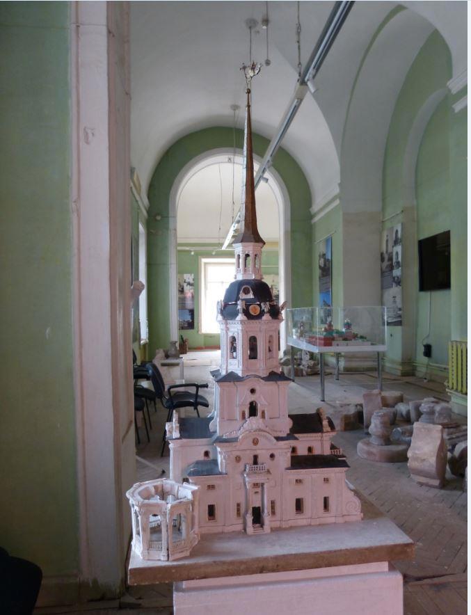 На выставке было много фотографий утраченных церквей и монастырей, а также макетов. Моё внимание сразу привлекла модель храма с высоченным шпилем. На подписи значилось, что это церковь Архангела Гавриила, известная также под именем Меншиковой башни. Но мы буквально неделю назад проходили возле этой церкви и я хорошо помнил, что никакого шпиля над ней сейчас нет. Так что решил освежить в памяти историю храма.
