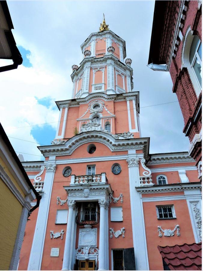 Уже в 1707 году над городом поднялась колокольня, увенчанная тридцатиметровым шпилем с фигурой ангела с крестом на самом верху. Сооружение было на полторы сажени (3.2 метра) выше, чем колокольня Ивана Великого (81 метр). А в 1708 года на эту колокольню установили часы с курантами, специально выписанные из Англии. Часы били каждый час и четверти часа, а в 12 часов начиналась колокольная музыка и продолжалась целых полчаса. Бой курантов сопровождался звоном пятидесяти колоколов, что должно было производить завораживающий эффект.