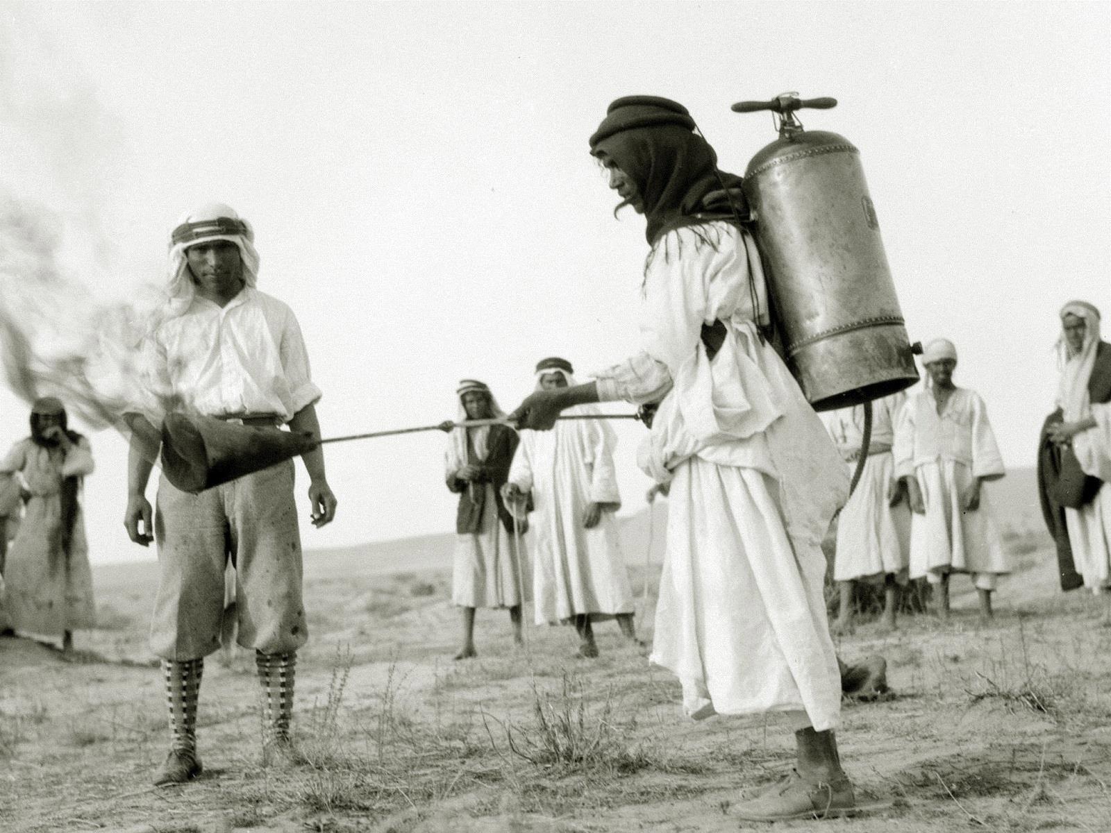 В тот год, на Палестину (входящую в Османскую империю), где население и так страдало от нехватки продовольствия, обрушилось нашествие саранчи, и такие крестьяне-огнемётчики как раз с ней и боролись. Об эффективности судить не берусь, но выделение огнемётов селянам говорит о серьёзной угрозе голода.(с)