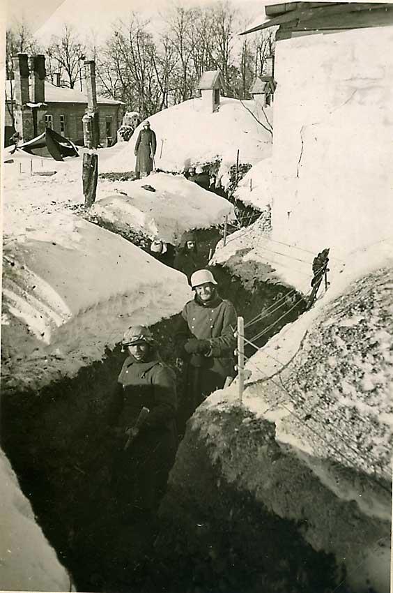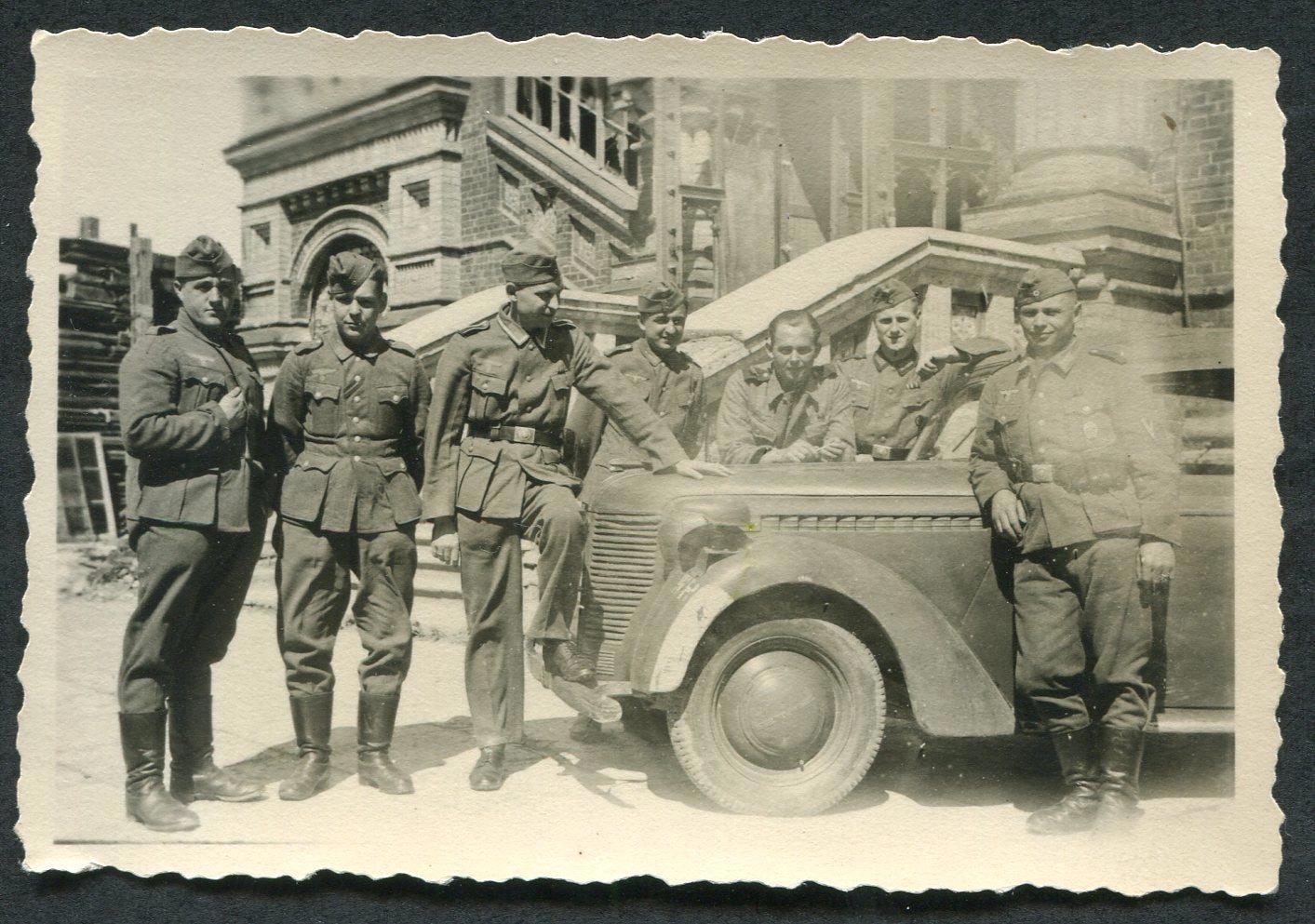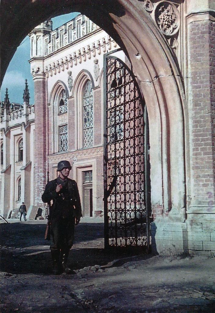 Немецкий солдат в Верхнем парке. Стоит на кромке круглой чаши фонтана, в принципе сгоревший броневик должен бы быть виден слева, но там деревья.