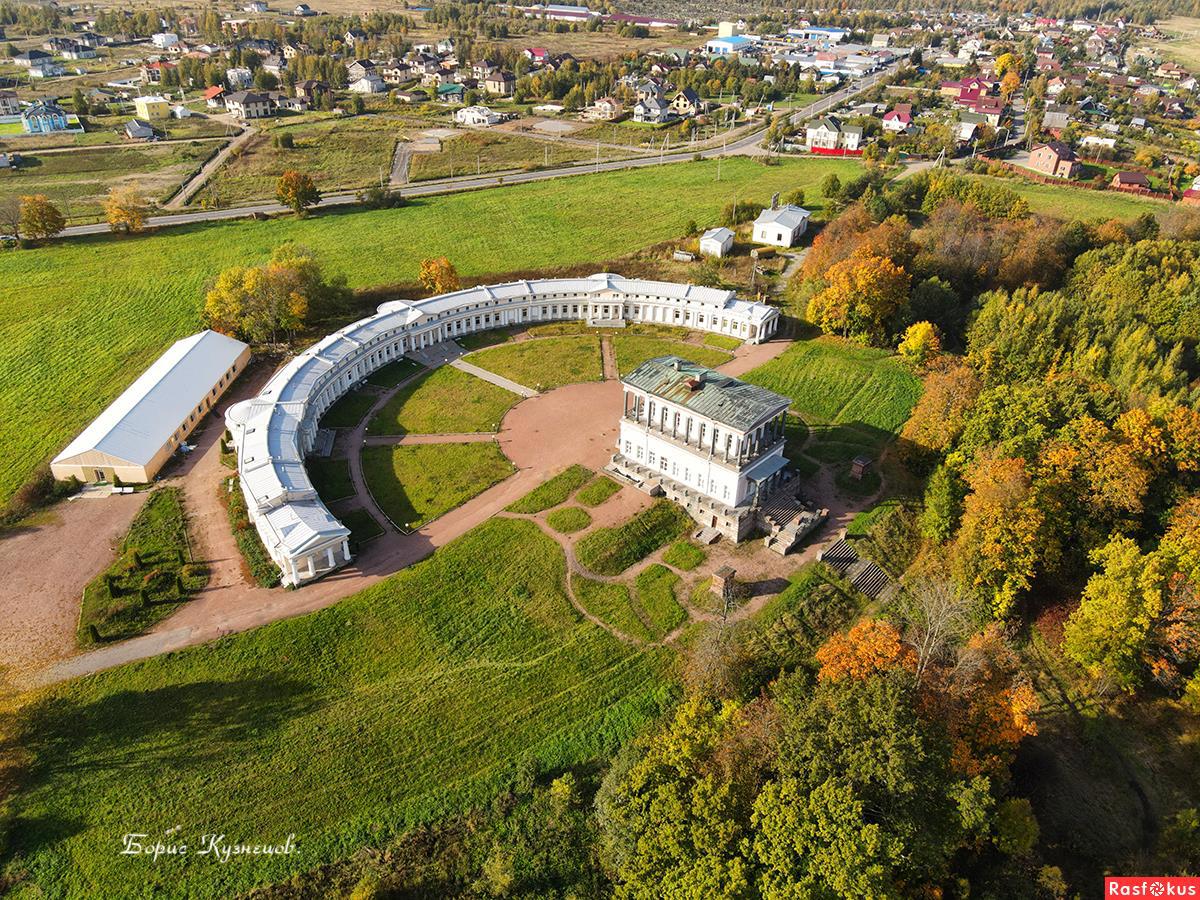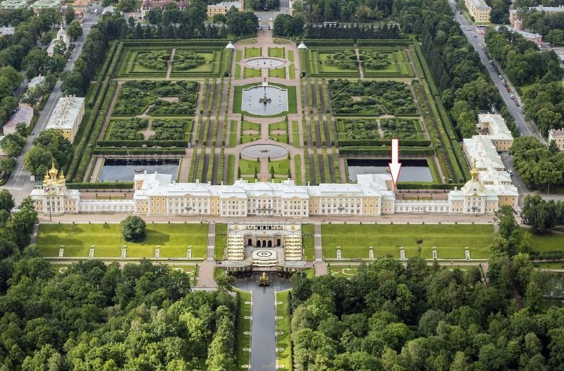 Вид на западное крыло дворца со стороны Верхнего парка. На современном фото, стрелкой указано место где стоит разбитый броневик.
