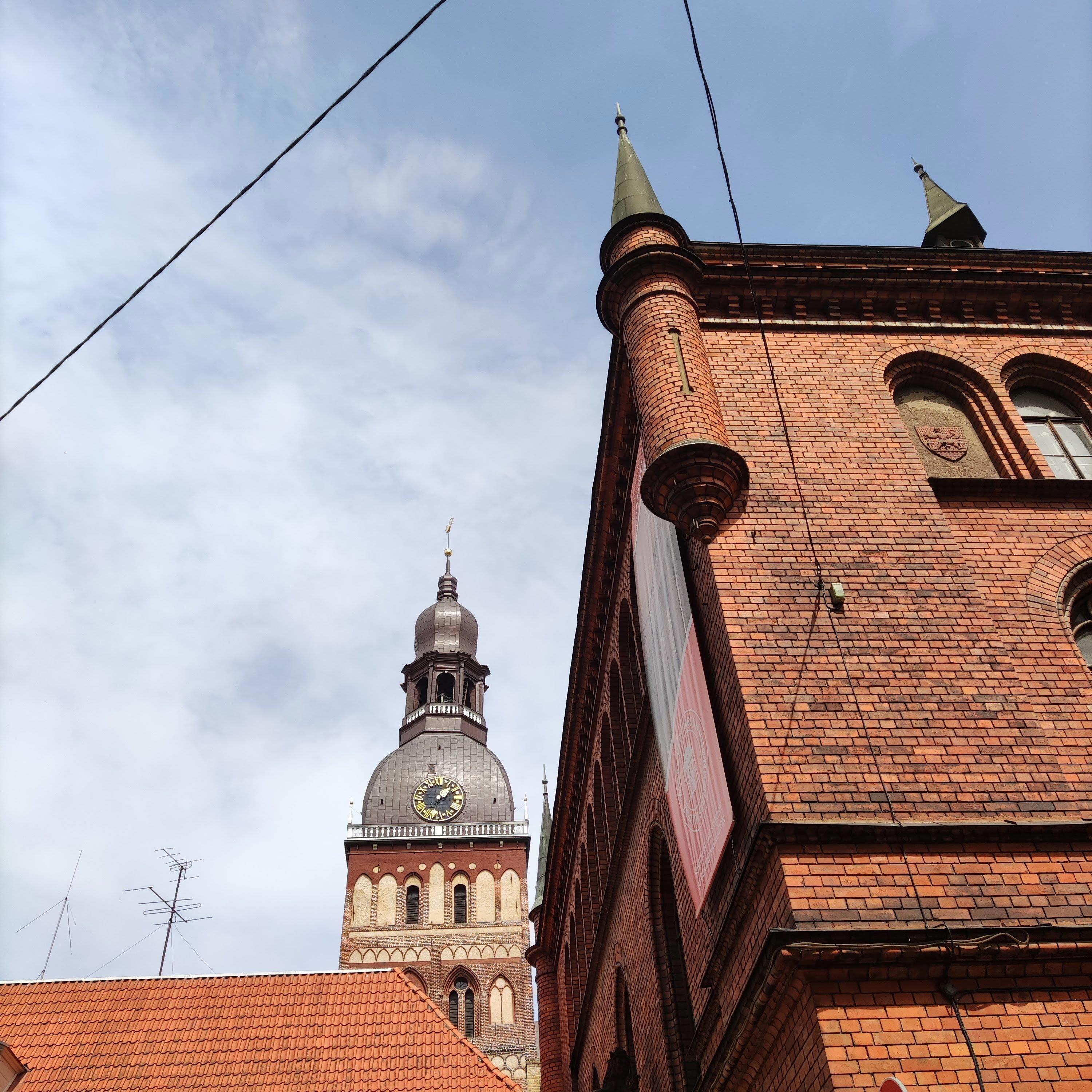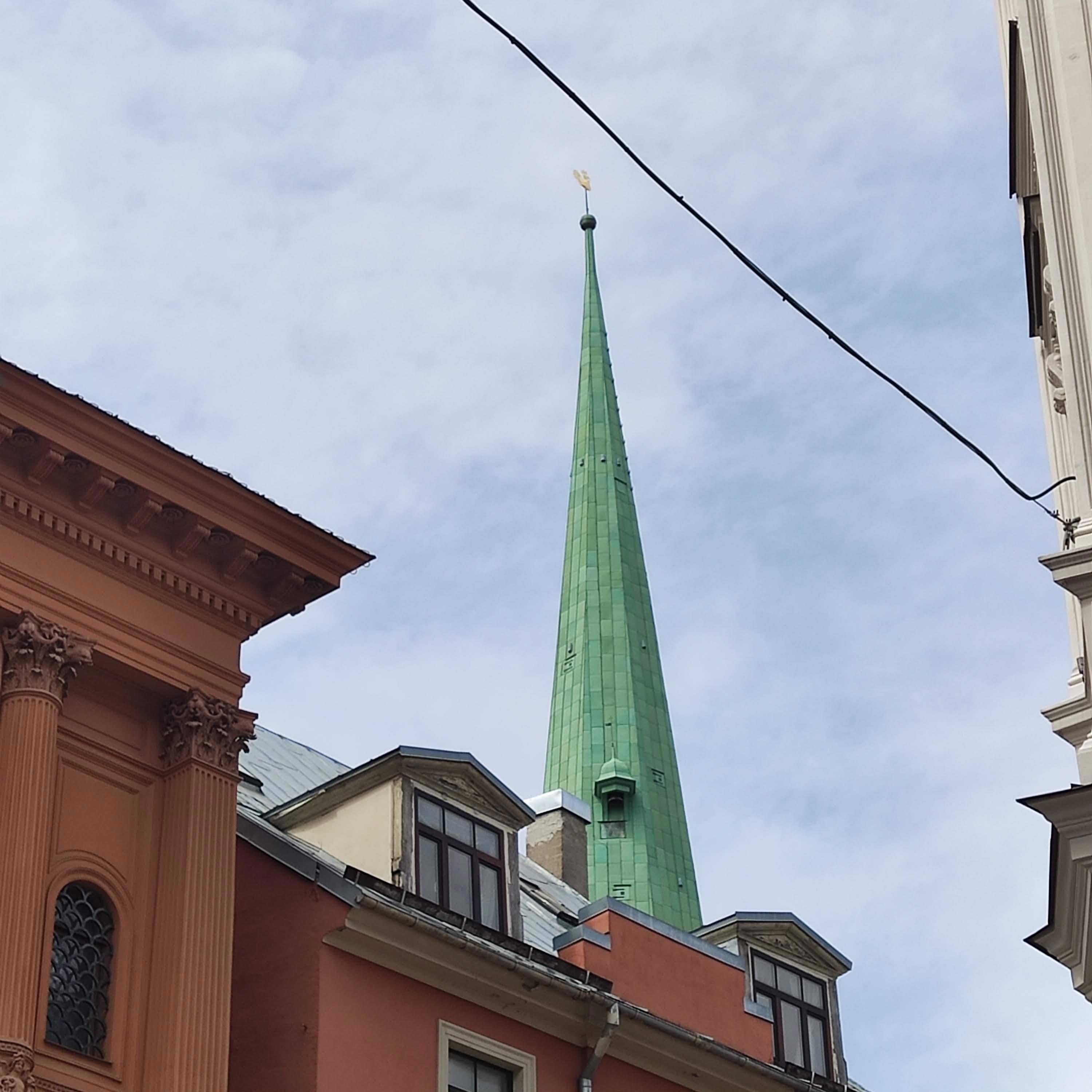 Шпиль кафедрального собора св. Екаба (Иакова), четвертой по величине церкви Риги. На верхушке, естественно, петушок и, вон тот маленький пипсик, - это часовой колокол. Его поместили под своим отдельным кивером для лучшего звона. К слову, считается одной из достопримечательностей города.
