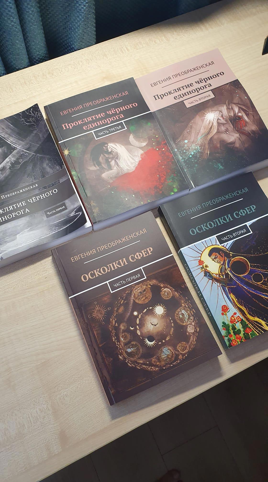 Автор: Евгения ПреображенскаяНе могу осознать своего счастья)) Пришли еще два тома Проклятия чёрного единорога и две книги Осколков сфер (это все фэнтези цикл Не в этом мире).