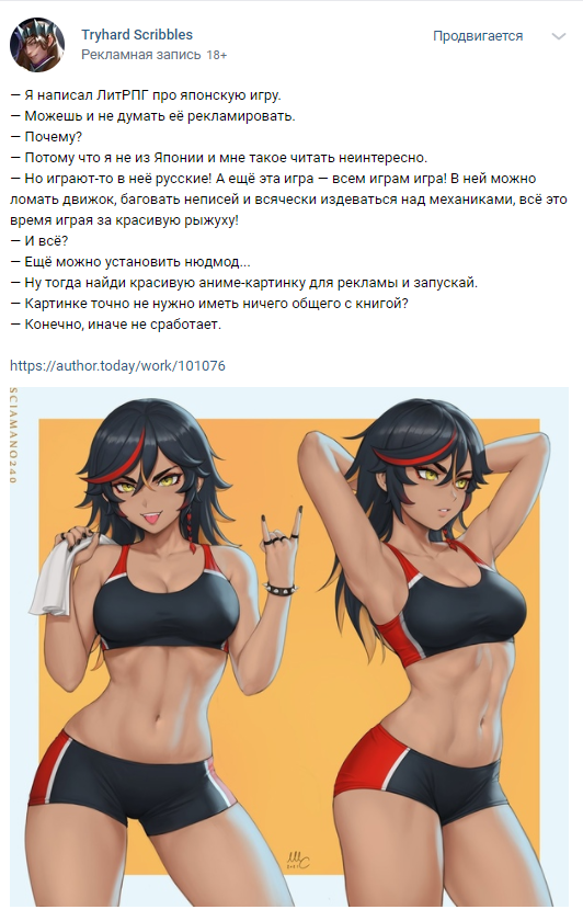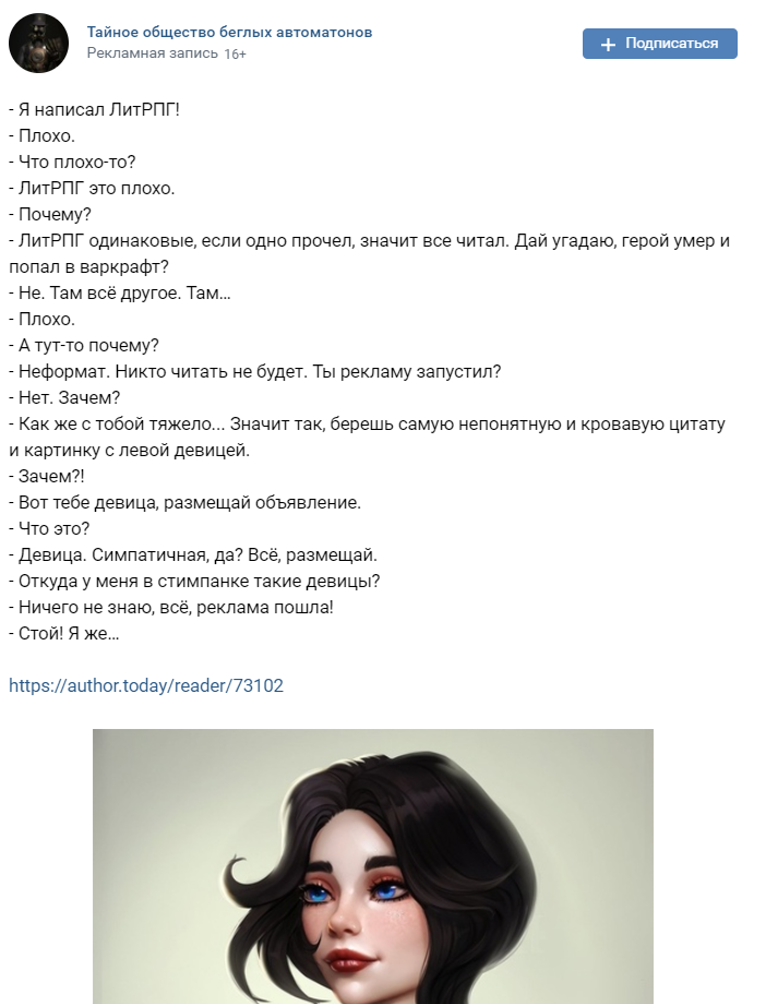 Вообще, мне деяние рук моего рекламщика нравится больше. Оно хоть что-то говорит про игру, в которую персонаж играет, и основные фишки развивает: Дэн у меня и правда тот ещё багоюзер и сволочь, которая обожает заставлять ИИ неписей лагать. Тут же всё, что я понял, так это, что ЛитРПГ про стимпанк.
