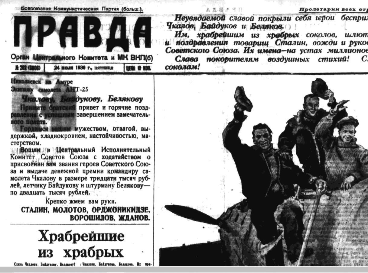 Словом, вполне достойная премия. Но, кстати, скромно на фоне наших бессмысленных футболистов и прочих «героев» текущего дня. Перелёт то Чкалова-Байдукова-Белякова был вполне прикладным подвигом, имевшим вполне (не побоюсь тут этого слова) геополитическое значение – демонстрировали не только всему миру мощь нашей авиатехники, но и демонстрировали Японской империи нашу способность быстро перебросить дальние бомбардировщики в случае чего… А то «чего» там как раз было – японцы уже захватили Маньчжурию и готовились в следующем 1937 году взять Пекин… А это вам не олимпиада, ё...