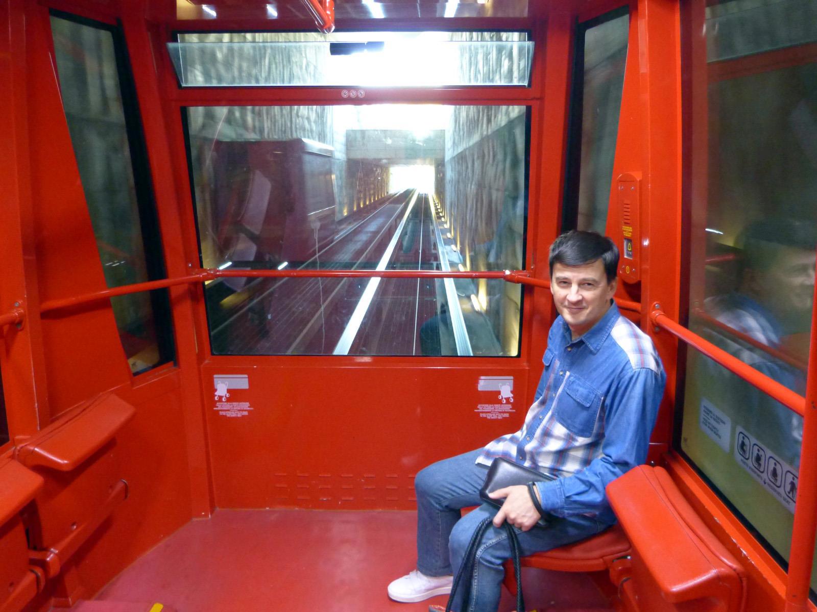 Вагончик имеет восемь откидных сидений и рассчитан на двадцать пять человек. Ходят такие вагончики с интервалом полторы — две минуты. Поездка из конца в конец занимает двенадцать минут.