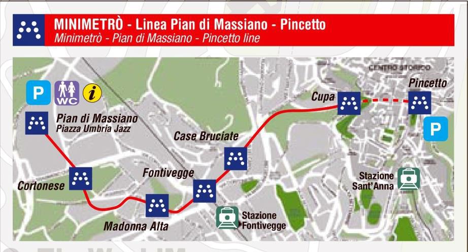Участок между станциями "Pincetto" и "Cupa" проложен в тоннеле под землёй, как раз под старым городом. Затем линия выходит на поверхность, где вагончики движутся по эстакаде.