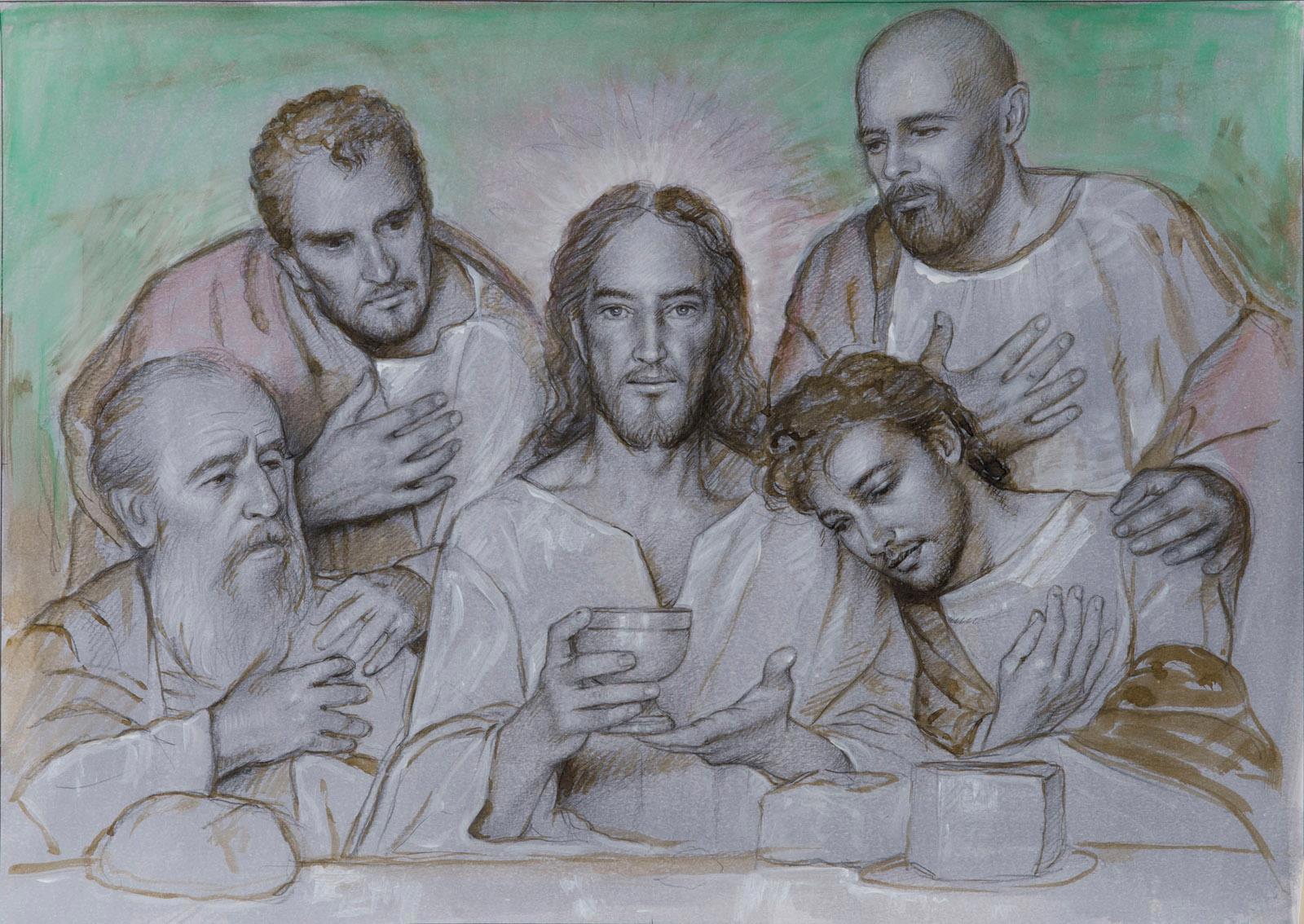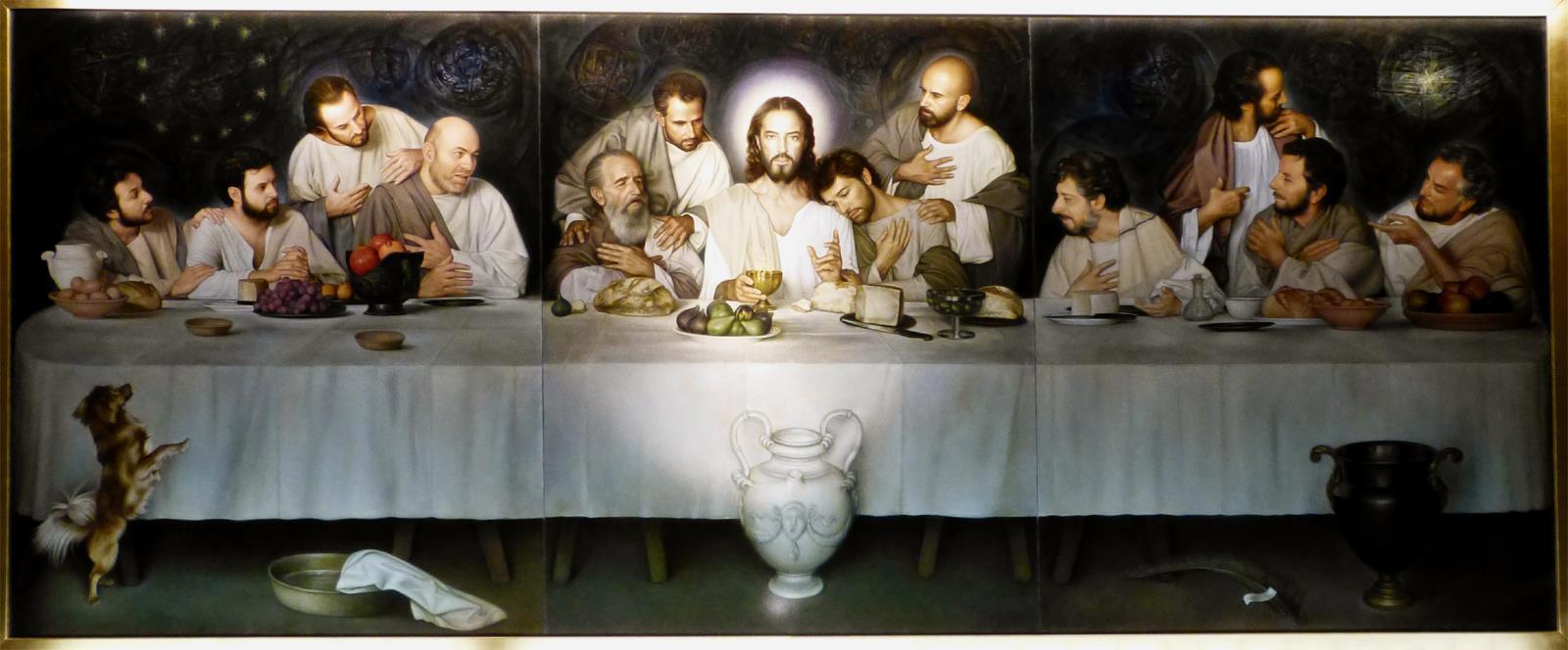 В одном из рукавов трансепта что-то светлело. Я подошёл поближе и увидел хорошо освещённую широкую картину на подставке. Это была современная версия "Тайной вечери".