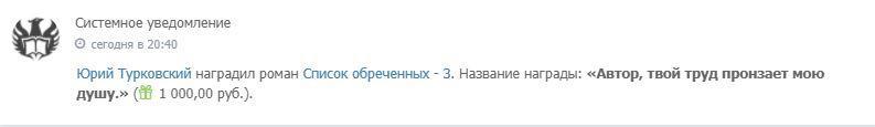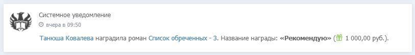Автор: Олег ВолховскийМне кинули еще одну награду в 1000 рублей. Тоже за третий том "Списка обреченных".