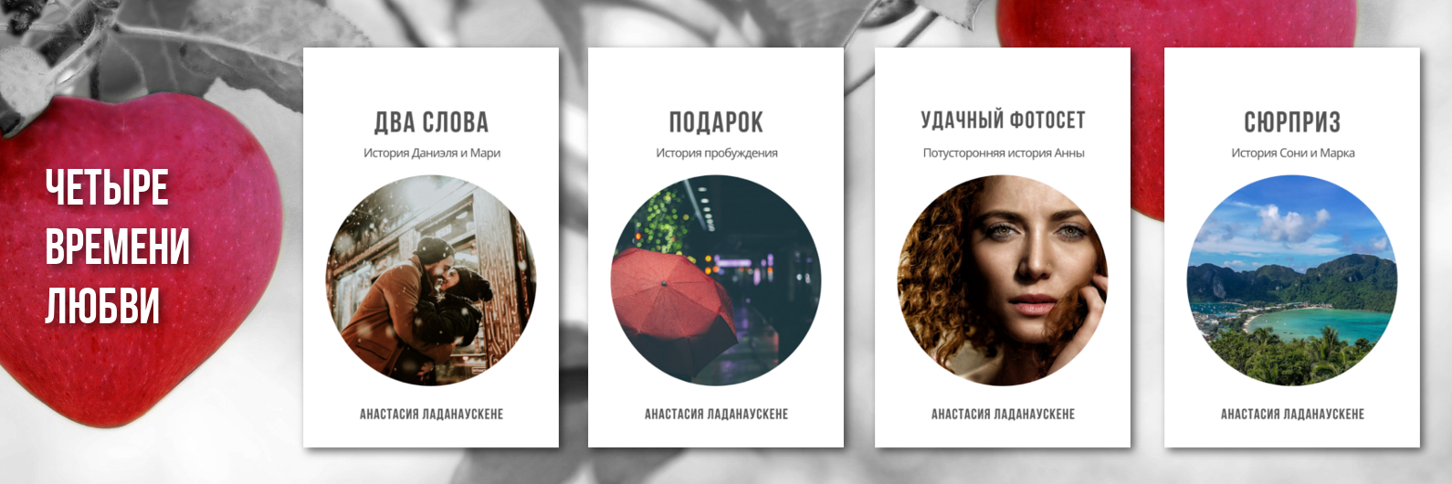 «Два слова», «Подарок», «Удачный фотосет» и «Сюрприз» — четыре тёплые, романтичные истории о верности и предательстве, о преодолении страха и боли, о любви к себе, с которой всё начинается, о терпении, юморе и доверии, помогающим чувствам вырастать и становиться глубже.