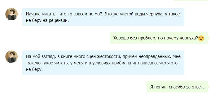 Что имею ввиду. Векша, уверен, вы знаете, что обладаете очень высоким уровнем доверия у авторов. Ваши рецензии очень высоко ценятся, за ними к вам, действительно, стоит очередь. Думаю, вряд ли среди тех, кто знаком с вашим творчеством, блогом или обзорами на книги, едва найдутся люди, которые будут отрицать, что сегодня вы рецензент #1 на портале АТ.