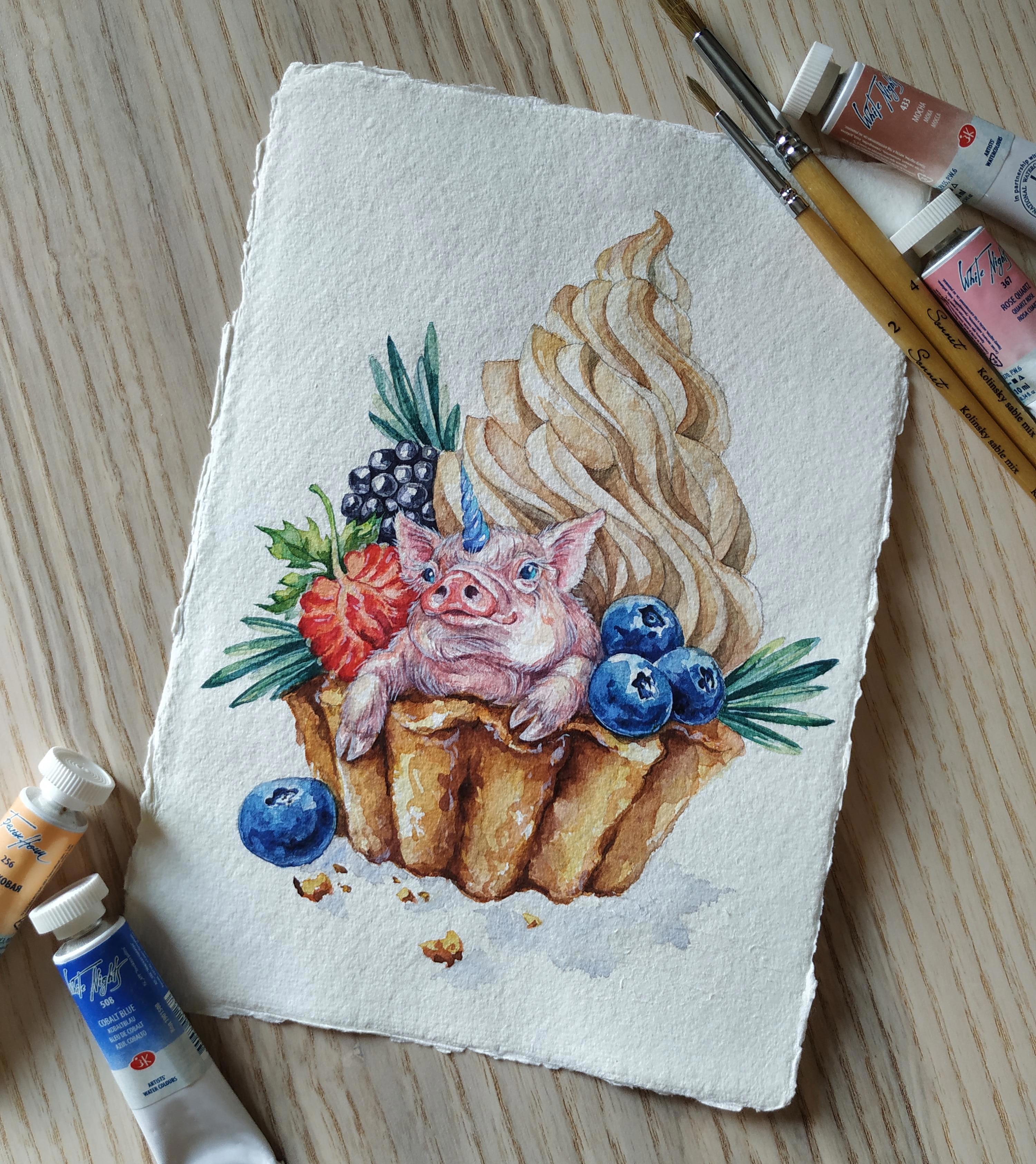 Автор: TanmornaСвинья-единорог в пирожном корзиночке с кремом и ягодами? Могу, умею, практикую!