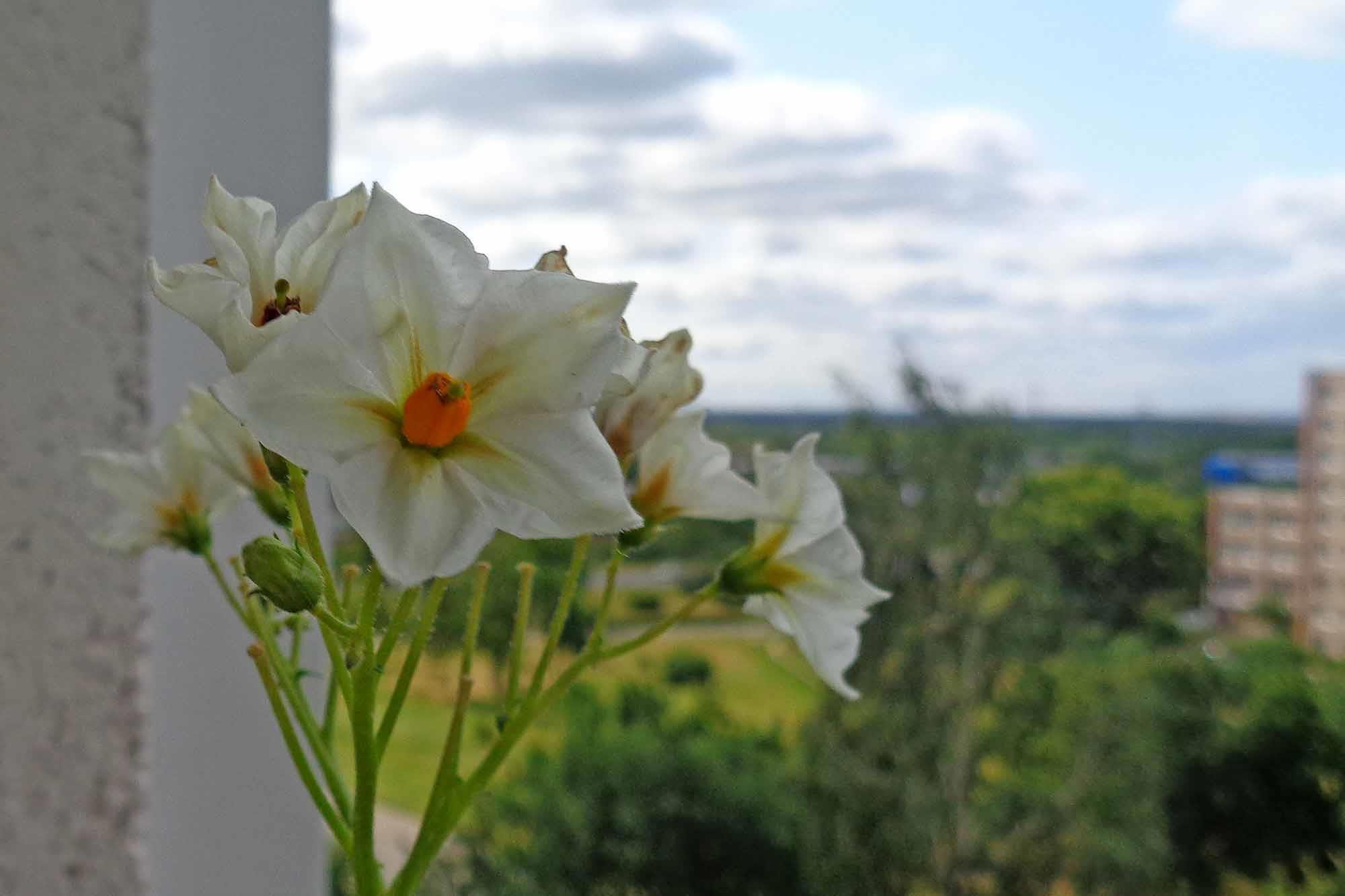 Картошка моя цветёт, хотя и ей до вчерашнего дня было слишком жарко, большая часть цветков отпала, не раскрывшись: