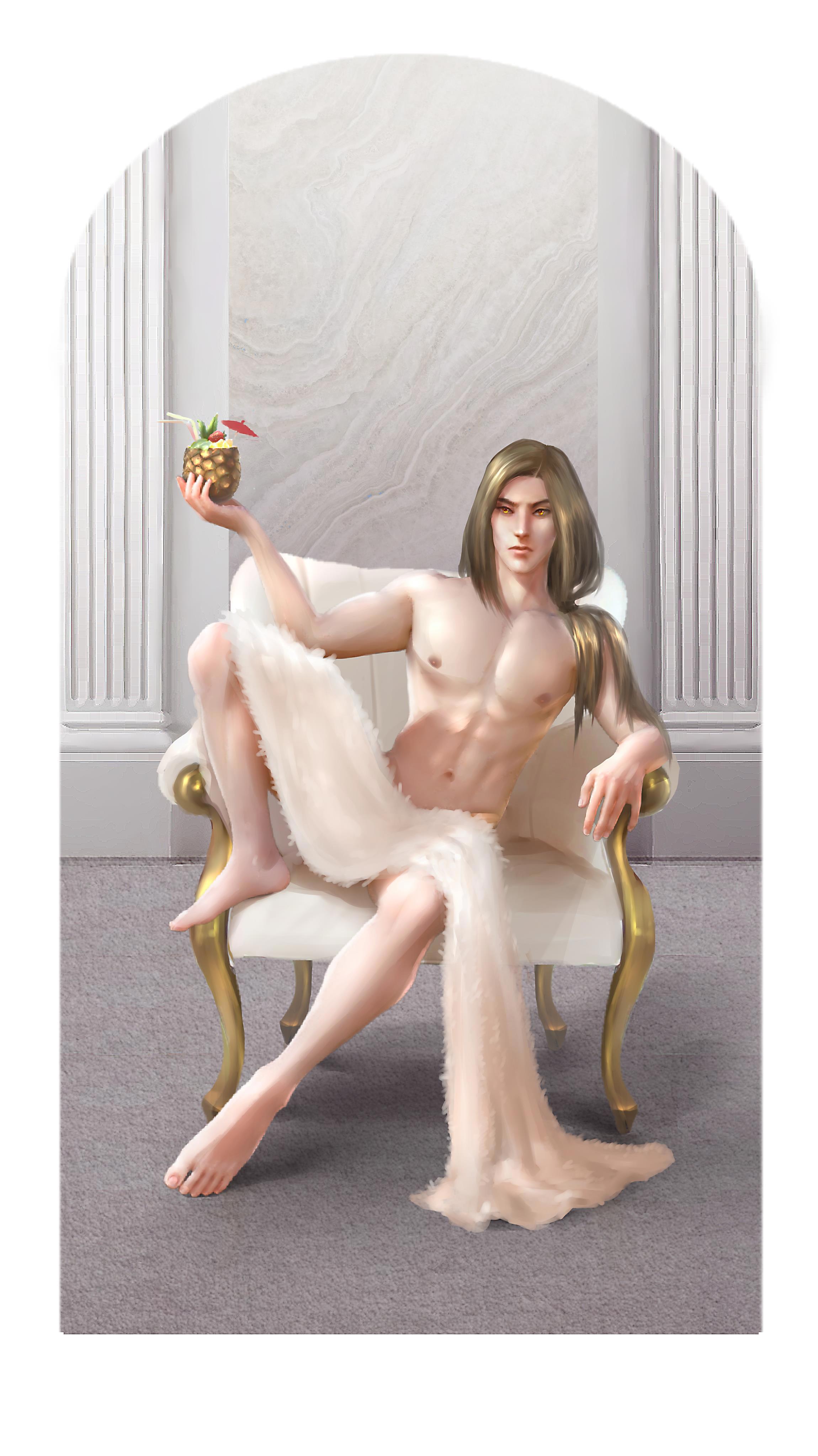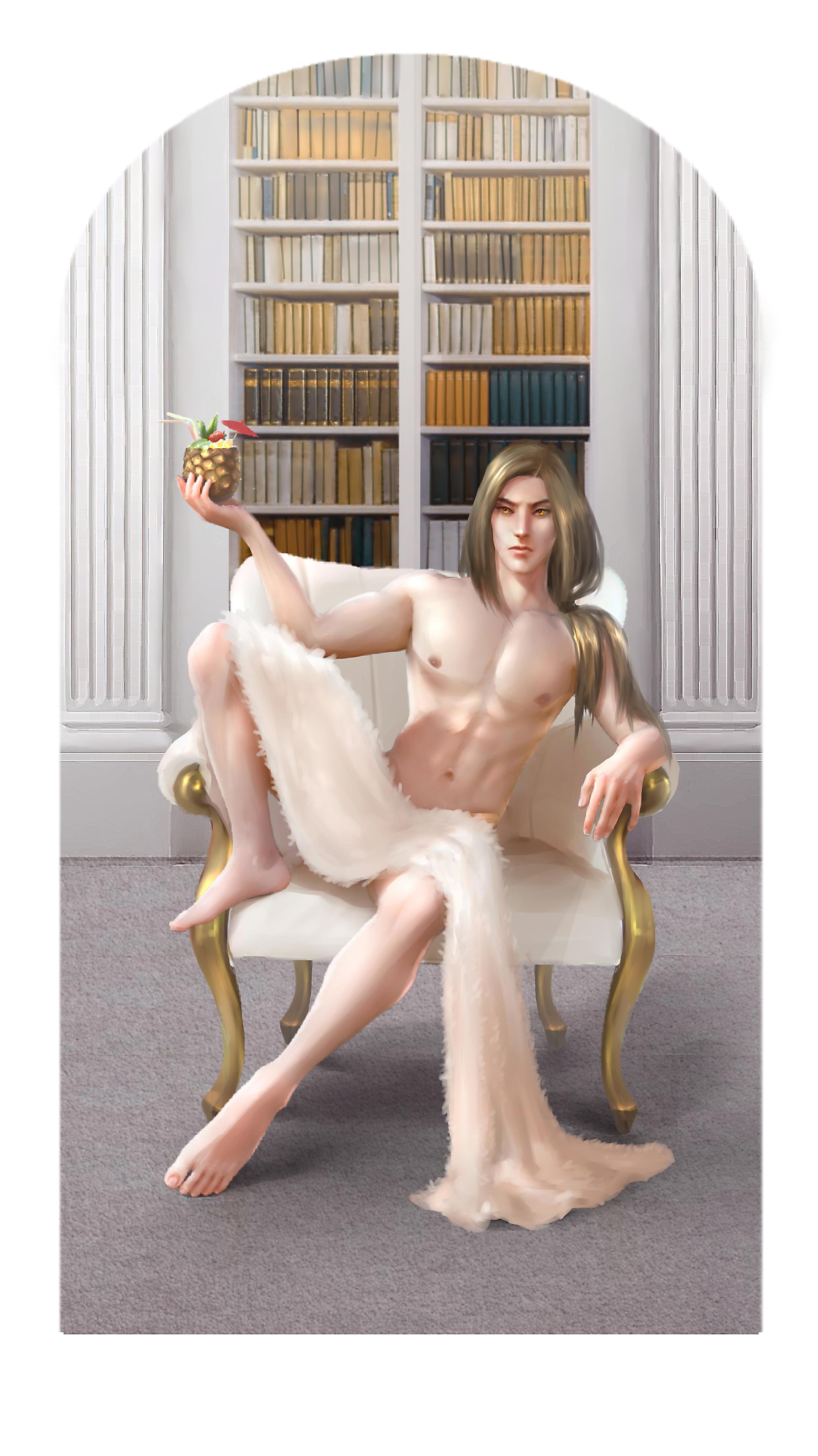 Небольшая подколка - в оригинале персонаж крайне строг и суров:) Попросили изобразить его нюд под пушистым пледом, с коктейлем в ананасе. Выражение лица - серьёзное. Интерьер соответствует описанию книги. Интересно узнают ли фанаты персонажа:)