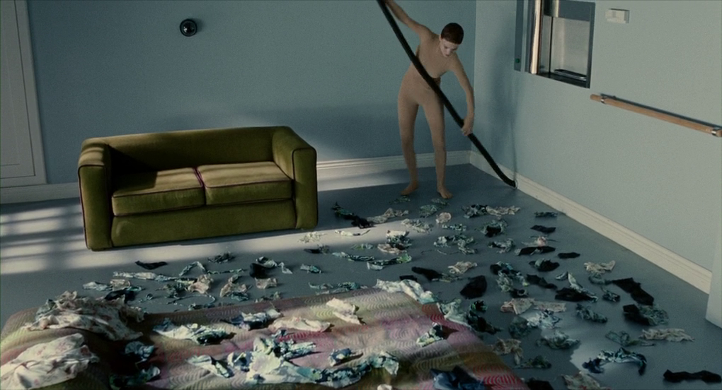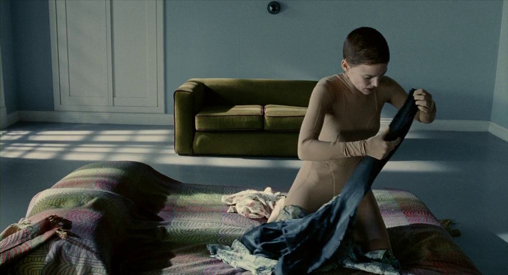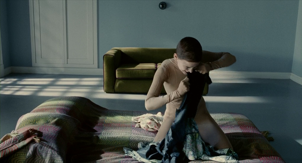 Физически, Вера почти готова. Но необходимо преобразить ее и внутренне. А это, как оказалось, гораздо труднее, чем телесные изменения. Ледгард дарит ей платья, которые она с ненавистью, руками и зубами рвет на мельчайшие кусочки и затем уничтожает с помощью пылесоса. Когда я смотрел фильм первый раз, то не обратил внимание на этот эпизод. Сейчас же, поразился, насколько же это красивая сцена и метафора непринятия женской сути. Сопротивление сознания навязываемой роли.